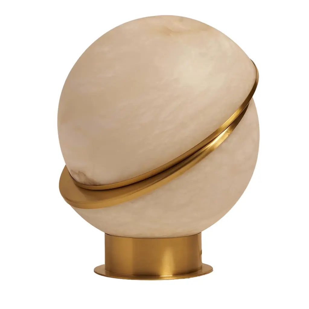 This elegant table lamp couples round volumes with exquisite materials, its delicate design suited to refined contemporary interiors. Considered the "stone of gods" since ancient times, alabaster is used in the alluring, hand-turned disk, placed between a round metal base and the spherical diffuser in light-brown Murano glass enlivened with a twisted optic texture.