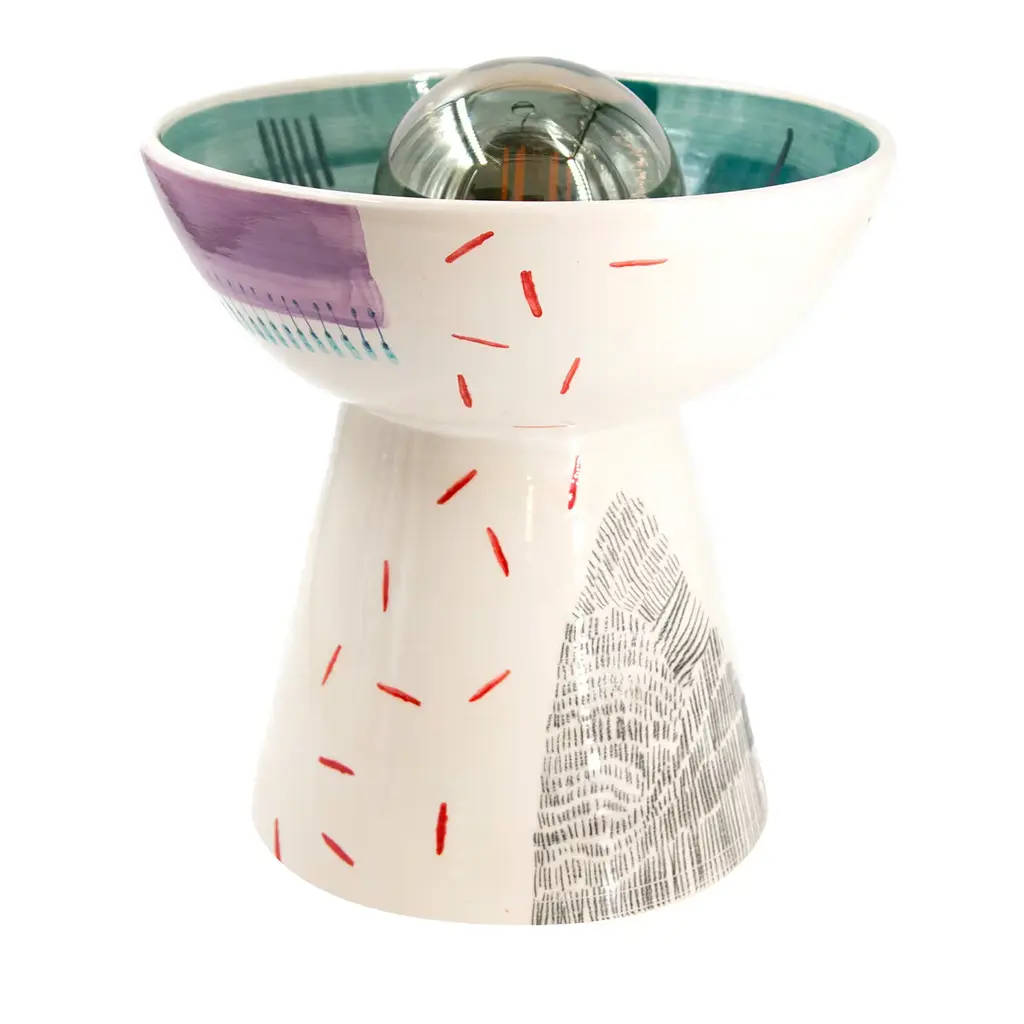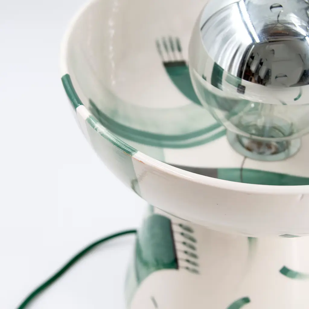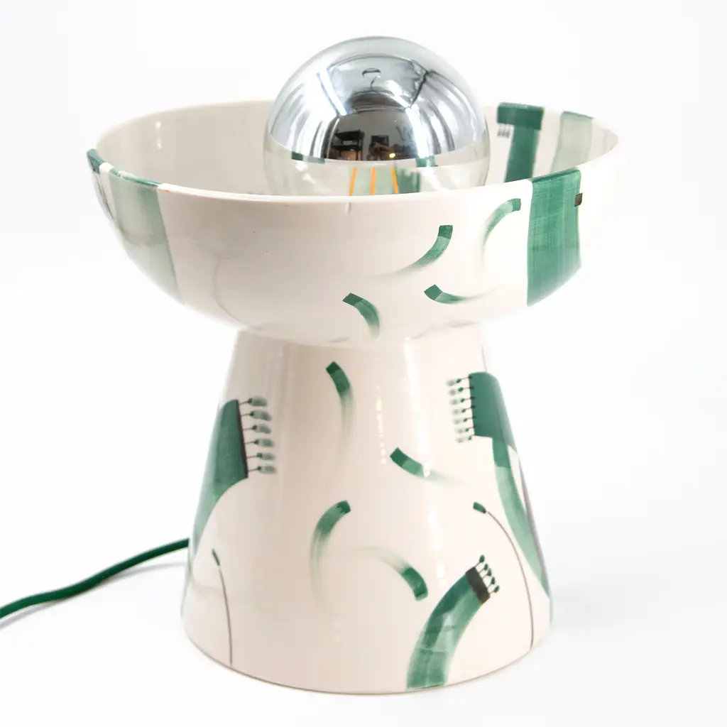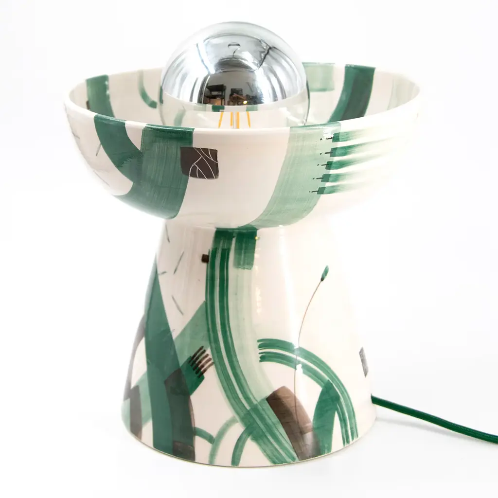 In this exclusive artisan table lamp in white ceramic, fluid, and secure brushstrokes offered in shades of sage, musk, and emerald green trace a vibrant decoration inspired by the dynamism of nature. Deftly painted by hand and indeed unique, the fresh decoration corrupts an otherwise rigorous interplay of geometric volumes. Please consult the Concierge for bulb specs.