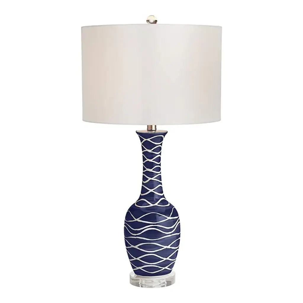 Product Details 30" high overall. Drum shade is 15" wide across the top and bottom x 10" high. Uses one maximum 150 watt standard-medium base light bulb (not included). On-off socket switch. Coastal modern style table lamp Lamp base has a white line wave pattern set against a Navy blue background. Ceramic lamp construction. White linen lamp shade. 8-foot long cord. The base features an eye-catching pattern of white lines inspired by coastal waves set against a Navy blue color background. The lamp's slender ceramic vase profile is sure to add visual interest to your decor, and is topped by a white linen drum lamp shade.