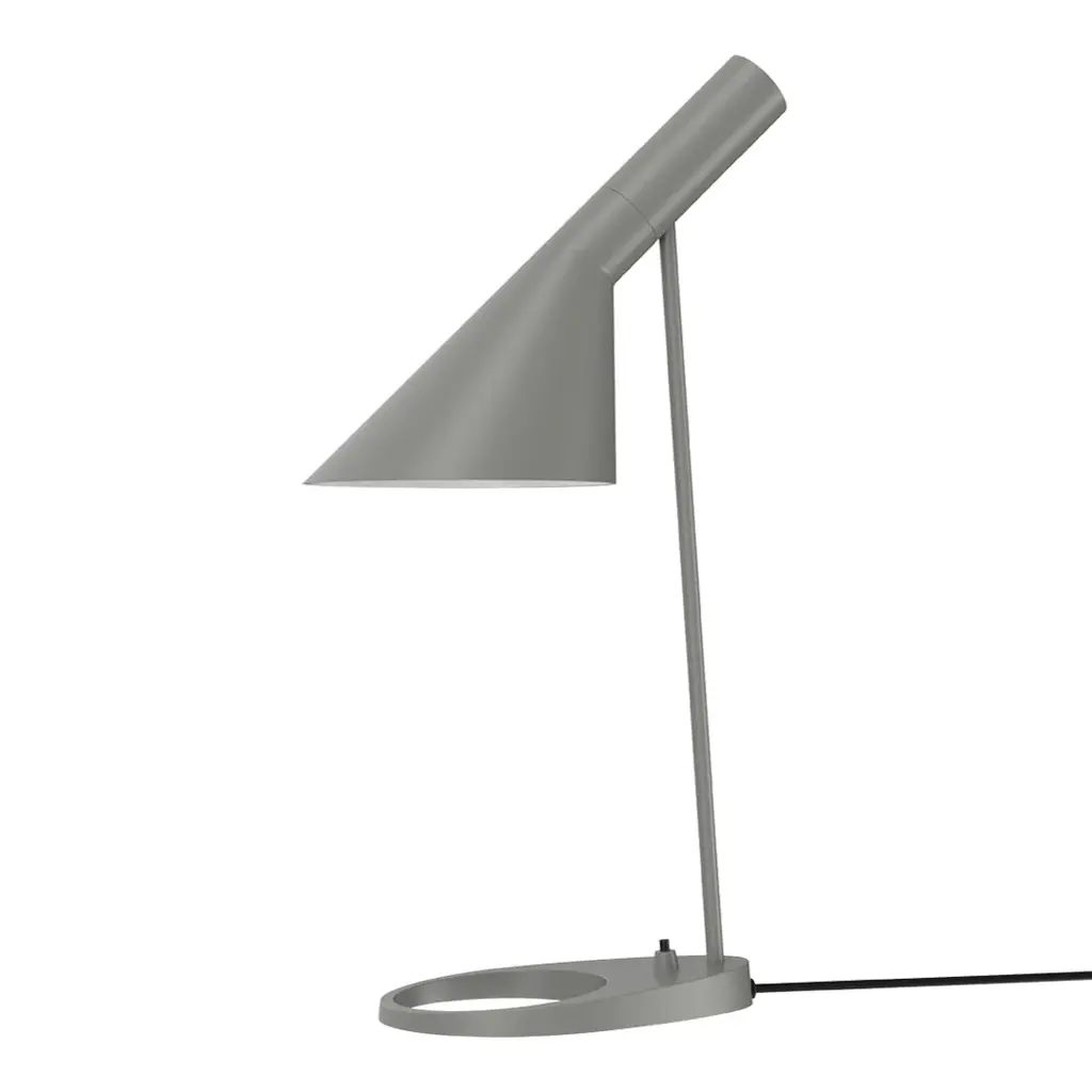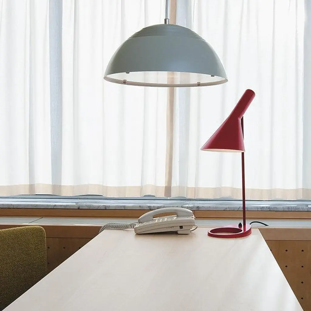 The AJ table lamp was designed, among other lighting fixtures, for the SAS Royal Hotel in Copenhagen. The AJ table lamp is on the same principles as the AJ floor, but due to the useability as a working desk lamp the shade has been expanded. The base of the table lamp was originally intended to accommodate an ashtray but now contributes solely to the design. The white lamp comes with a white cord, while all other colors come with a black cord. An on/off switch is located on the base.