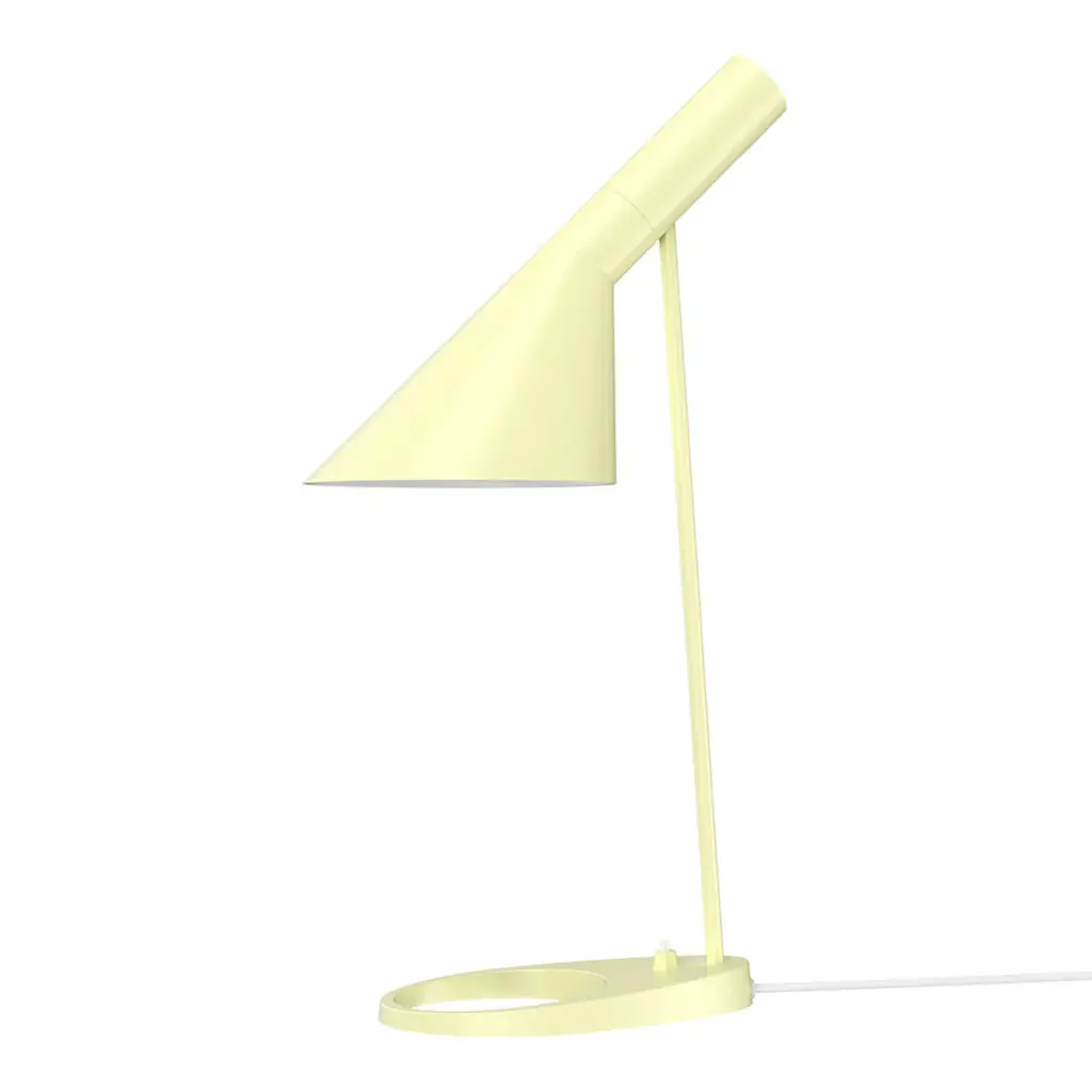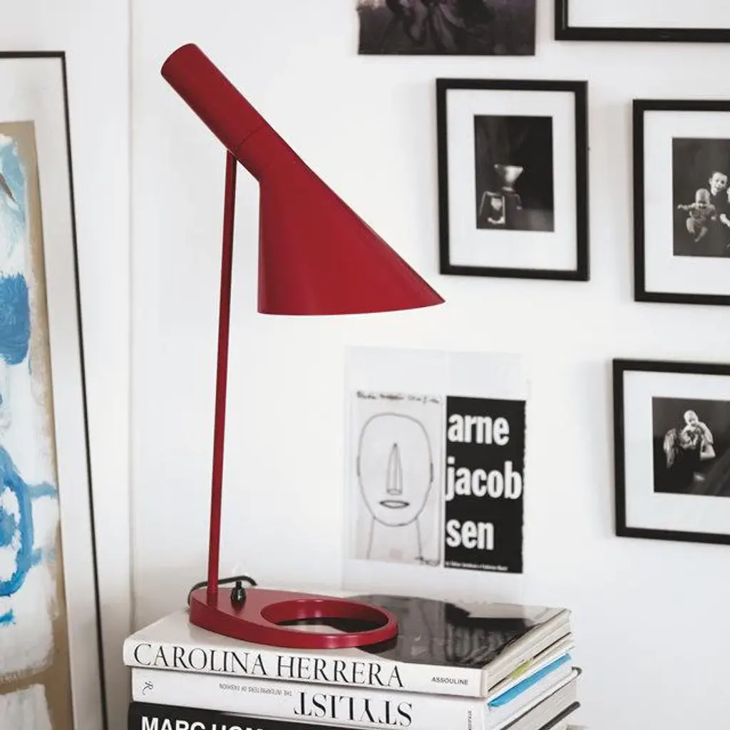 The AJ table lamp was designed, among other lighting fixtures, for the SAS Royal Hotel in Copenhagen. The AJ table lamp is on the same principles as the AJ floor, but due to the useability as a working desk lamp the shade has been expanded. The base of the table lamp was originally intended to accommodate an ashtray but now contributes solely to the design. The white lamp comes with a white cord, while all other colors come with a black cord. An on/off switch is located on the base.