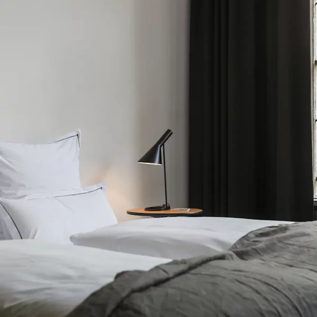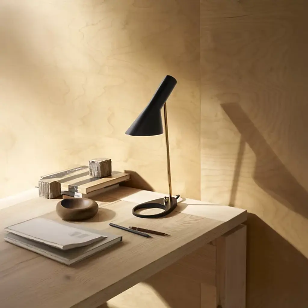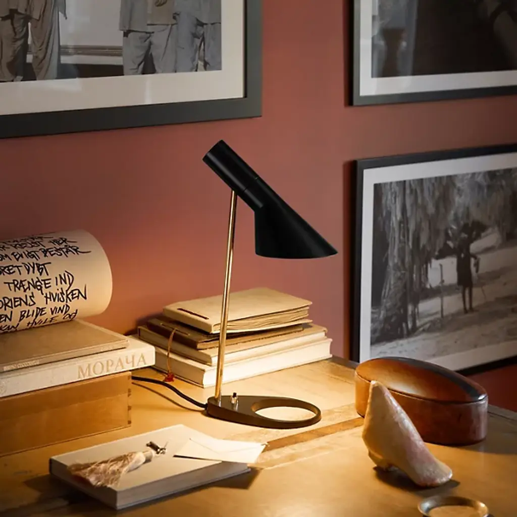 Gift your favorite space a premier, world-famous piece. The AJ Table Lamp from Louis Poulsen was designed in 1957 by Arne Jacobsen. Created for the SAS Royal Hotel in Copenhagen, the distinct, sleek form and minimalist style of this piece match the contours of Scandinavian Airlines seats and the geometry of the building. A sense of hidden, yet pleasing symmetry can be found in this piece as the rounded base matches the sharp angle of the shade. With a white interior, the shade sends out a bright and even layer of light that encompasses the immediate area in a welcoming glow.