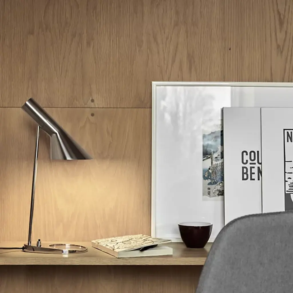 Gift your favorite space a premier, world-famous piece. The AJ Table Lamp from Louis Poulsen was designed in 1957 by Arne Jacobsen. Created for the SAS Royal Hotel in Copenhagen, the distinct, sleek form and minimalist style of this piece match the contours of Scandinavian Airlines seats and the geometry of the building. A sense of hidden, yet pleasing symmetry can be found in this piece as the rounded base matches the sharp angle of the shade. With a white interior, the shade sends out a bright and even layer of light that encompasses the immediate area in a welcoming glow.