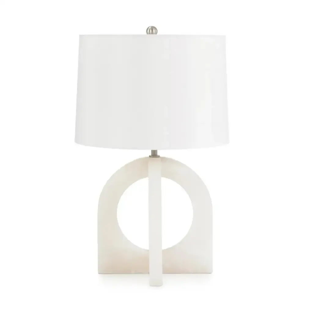The Castellina Table Lamp is a stunning, symmetrical work of art that will draw visual interest to any section of an interior space. Two intersecting arches of alabaster form a hollow body, demonstrating mastery over the intelligent use of negative space. The neck of the piece is finished in a gorgeous Brushed Nickel, with a rounded finial to match.