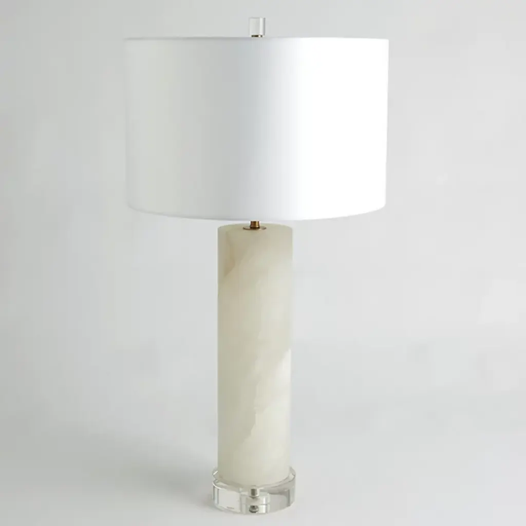 The Alabaster Cylinder Table Lamp-Brass by Global Views brings a sense of beauty and simplicity to spaces. Topped with a crisp, hardback fabric shade that is accented with a minimal finial, the body of this cylindrical table lamp is created from a solid block of alabaster stone and is set on top of a lovely solid crystal base. Brushed metal fittings add a thoughtful touch to the natural stone used in this design, and each piece showcases its own unique veining and color, lending an elegant touch to rooms.