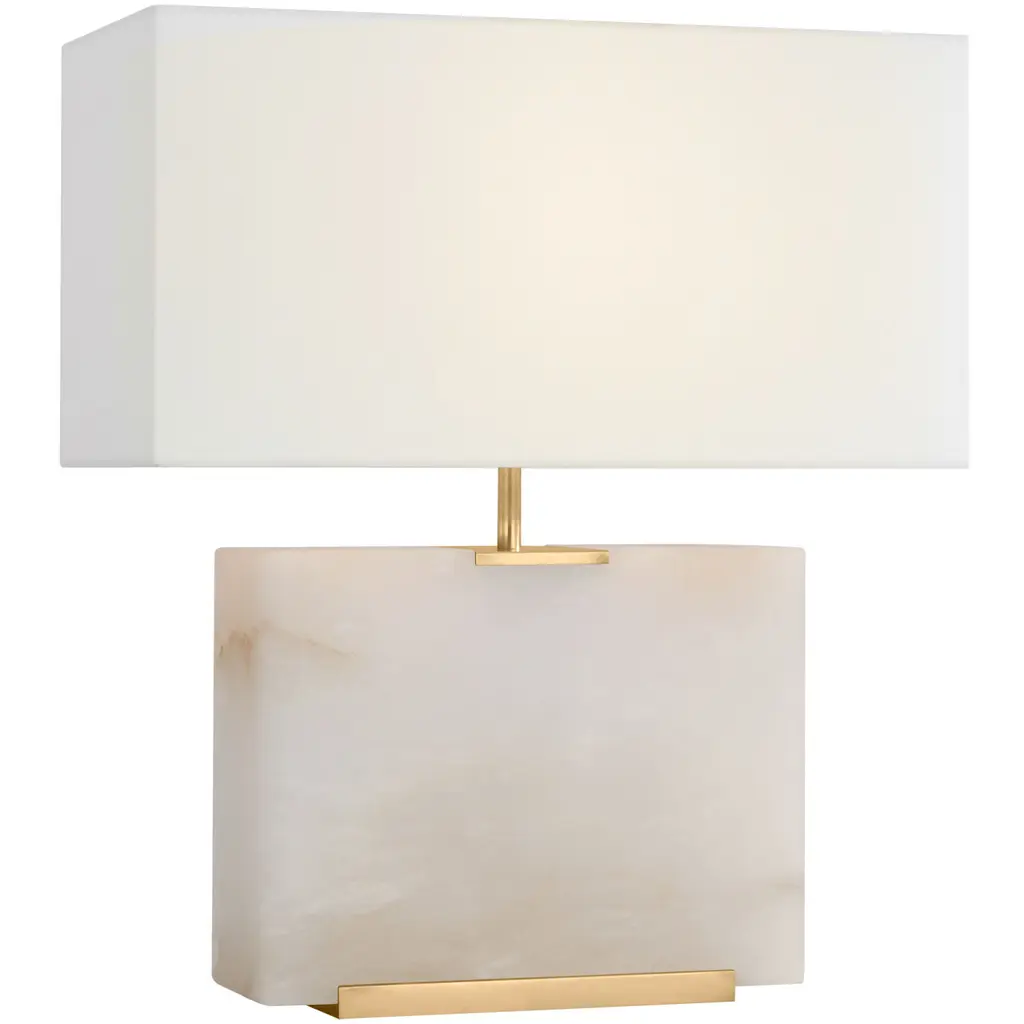 Beautiful sheets of natural material make the Alabaster Rectangular Table Lamp from Global Views a design that’s unique to you. Each alabaster sheet invites a closer look at its veining pattern and subtle shifts in color. Artisans arrange the sheets into a tall cube shape, giving the artful material a bold geometric silhouette. The milky hue of the alabaster enhances the rich color of the metal stem and the crisp quality of the solid crystal base. A hardback fabric shade gives the piece a comfortable sense of balance in its clean geometric form. Bulbs inside leave a warm, ambient glow on the shade. The comfortable light flows down to accentuate the texture-rich alabaster.