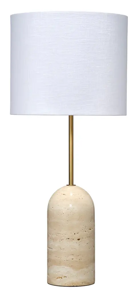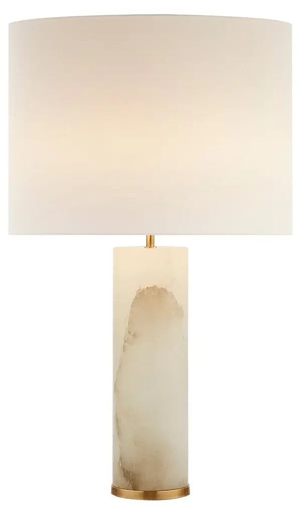 DESCRIPTION Hampton Hill's Prague Alabaster Table Lamp brings a chic cultured look to your home. Made from a natural variation of white alabaster with a gold metal base, this table lamp adds an elegant touch to any transitional décor. The white drum-shaped shade perfectly filters the light to soften the look of your room. Plug in this table lamp using the 72-inch clear cord, which provides plenty of length to fit in most spaces and an on/off switch on the socket offers easy access to operate the lamp. With a refined style, this table lamp brings a beautiful look to accent your living room. PRODUCT DETAILS See below 1 Table Lamp: 16"Dia x 30"H Shade Size: 16"Dia x 11"H Base Dimensions: 4.75"Dia x 17"H Socket Size: 1.5"Dia x 2.5"H Cord Length: 72" MATERIAL 70% alabaster, 15% iron, 15% fabric Shade Fabric: 65% linen, 35% cotton Base: Metal and alabaster Metal Finish: Gold