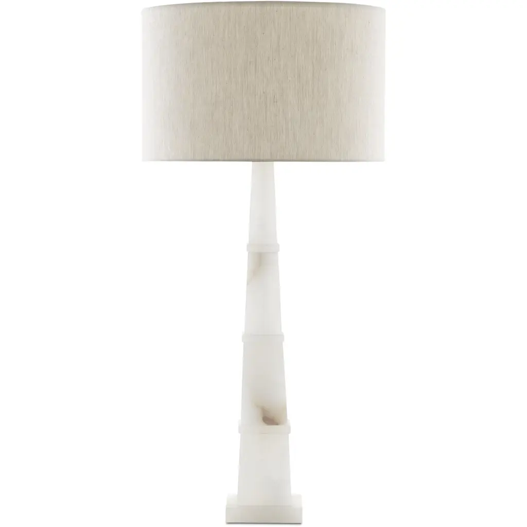 Stacked alabaster creates an obelisk shape to make our Alabastro Table Lamp luxurious. Its designer Tom Caldwell calls it a simply elegant shape in translucent stone that is beautifully veined. This white marble lamp is topped with a natural linen shade.