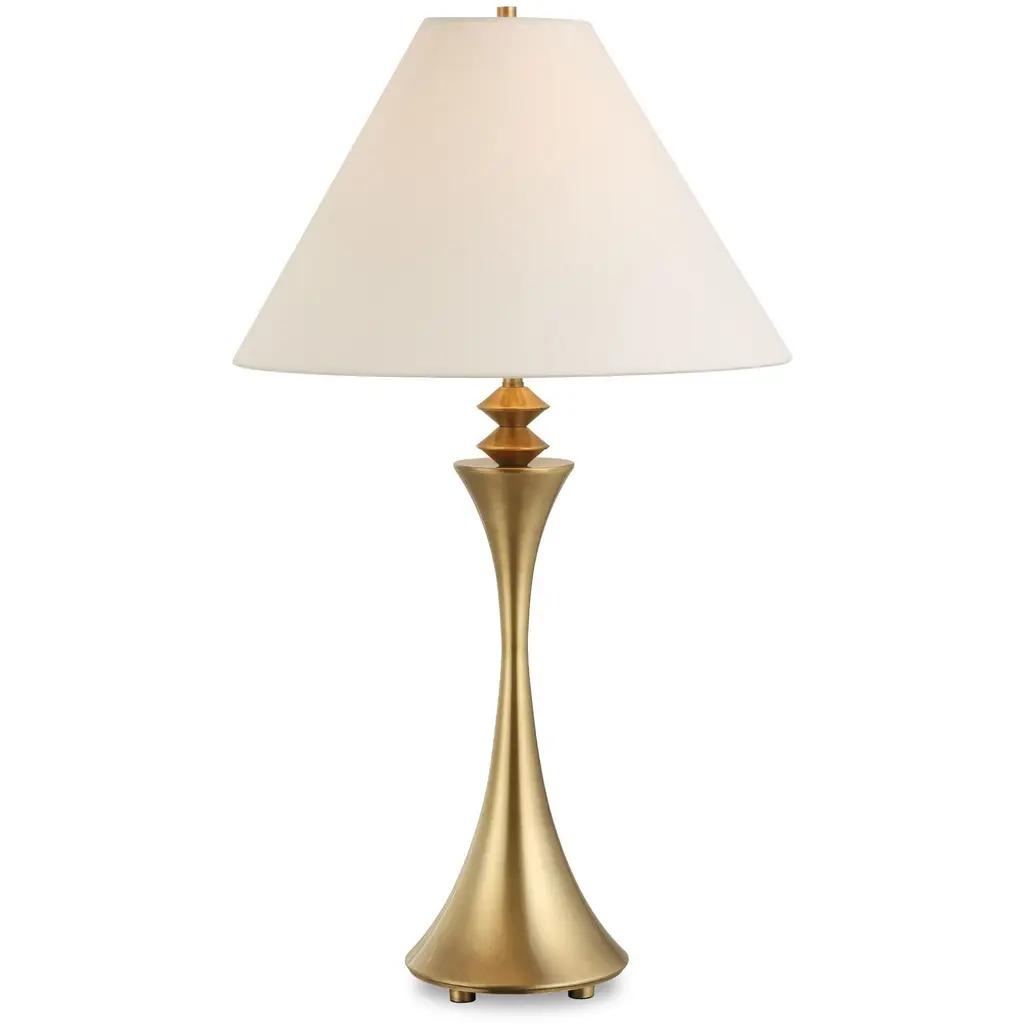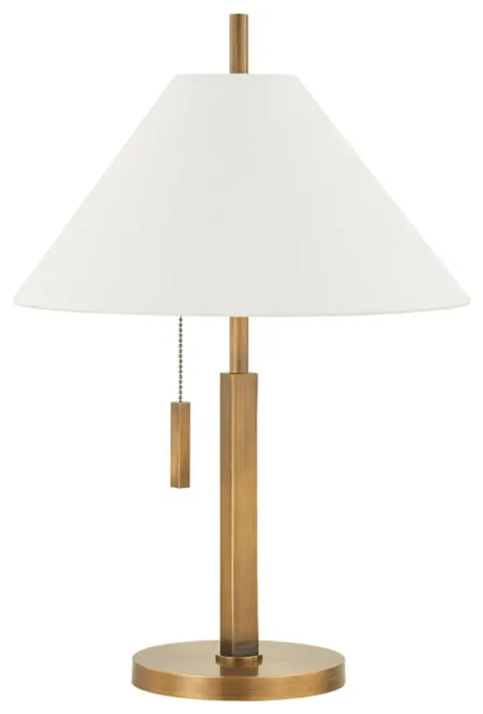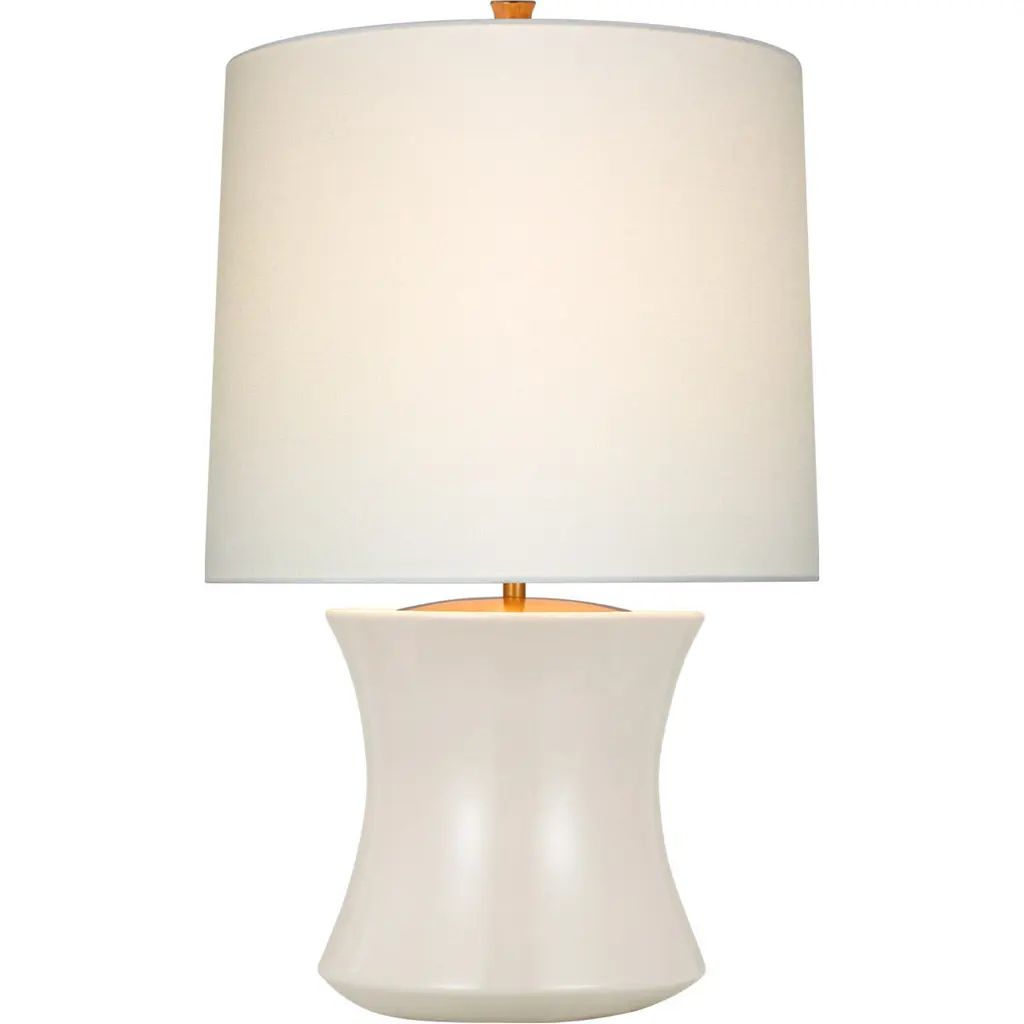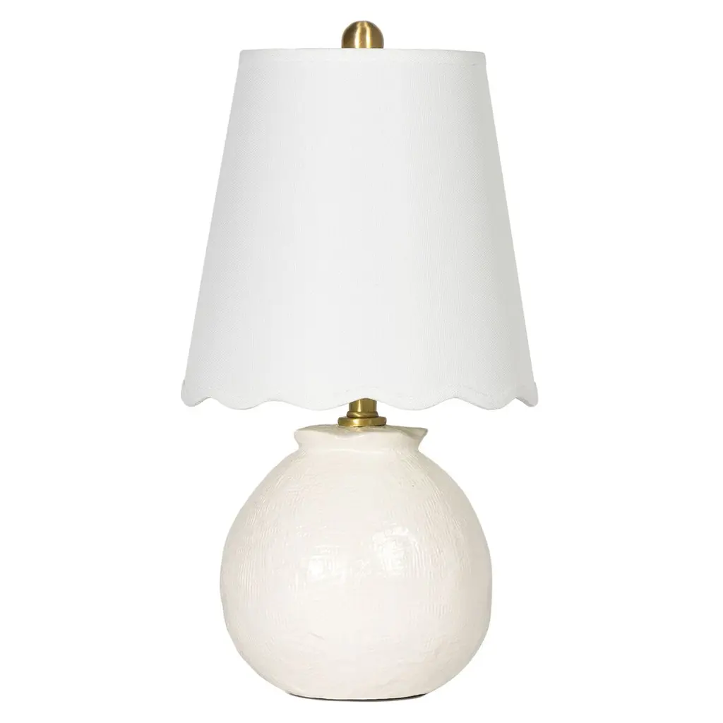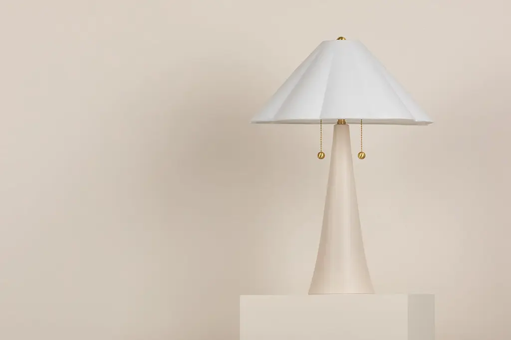 Alana keeps things light and airy. A pretty scalloped shade in white linen is adorned by aged brass accents like metal balls, chain work, arnd canopy. Pull chains on each side of the ceramic table lamp dangle like earrings, adding both function and fashion.
