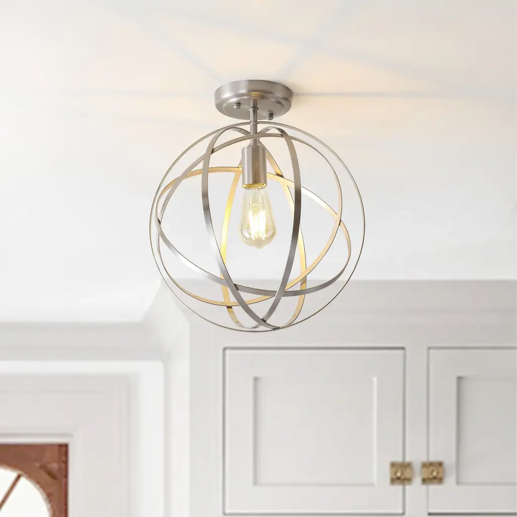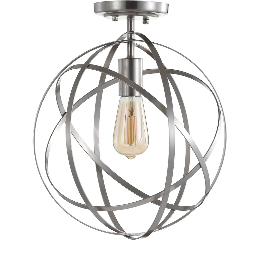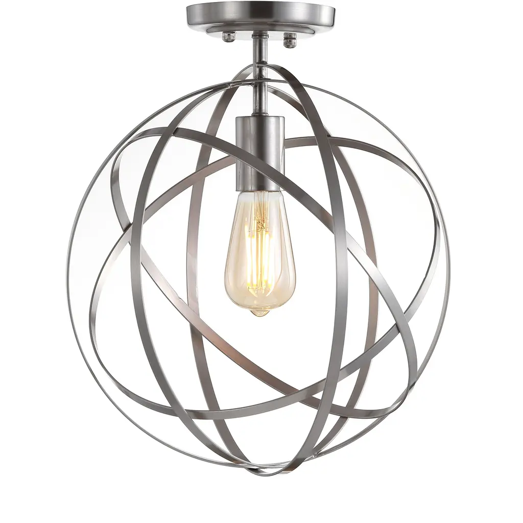 Rings of metal are expertly soldered together to create a spherical frame for the bulb of your choice -- incandescent, LED, or CFL. We love incorporating novelty bulb silhouettes or filaments for added interest, and one LED (as pictured) is included. Especially stunning in a breakfast nook or small room, with only a 15" depth, this is a semi-flush mount fixture that packs a lot of style into a small space. Features:Dimensions:About us:You see a lamp.We see a decorative work of art.A perfectly curved shade casts a dramatic shadow on a floor. A silk cord you never want to hide. LED lightbulbs: as easy on the environment as they are on the eyes. The JONATHAN Y Lighting collection considers every detail from impeccably sourced materials to designer styling. And our prices are so attractive, we've transformed a functional necessity into a fashion accessory.JONATHAN Y Lighting - a fashion revolution in home decor.