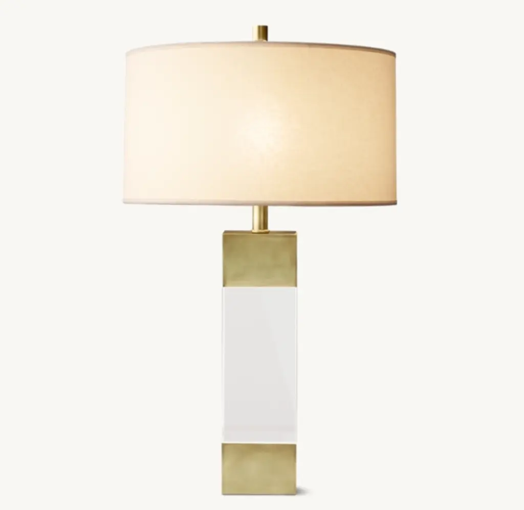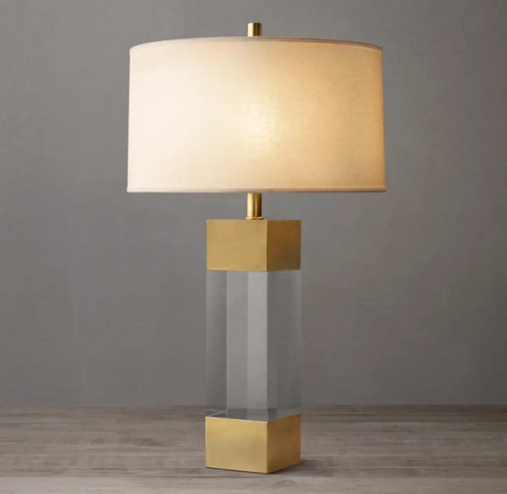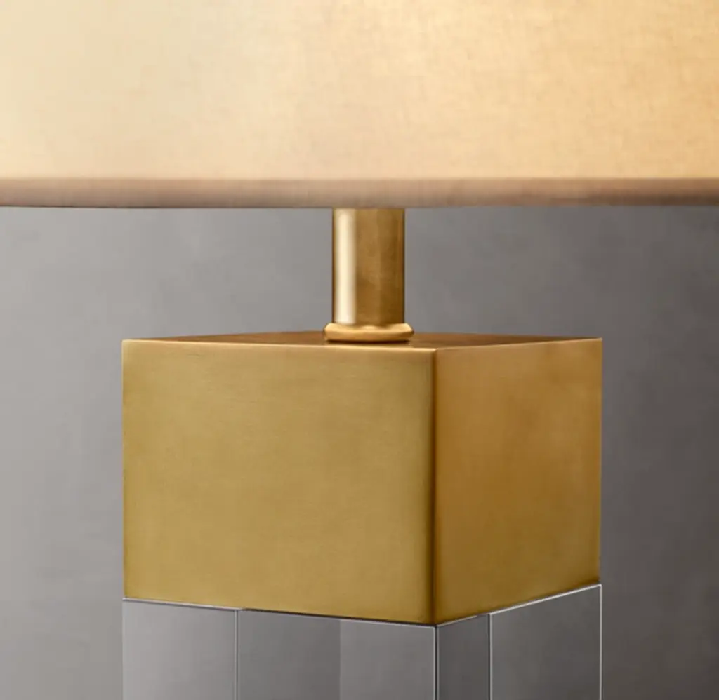 The classic 1970s Lucite block lamp is reimagined in transparent crystal. Designed by Ian K. Fowler, our version features a restrained, cubic column of clear crystal glass bookended at top and bottom in richly finished metal.