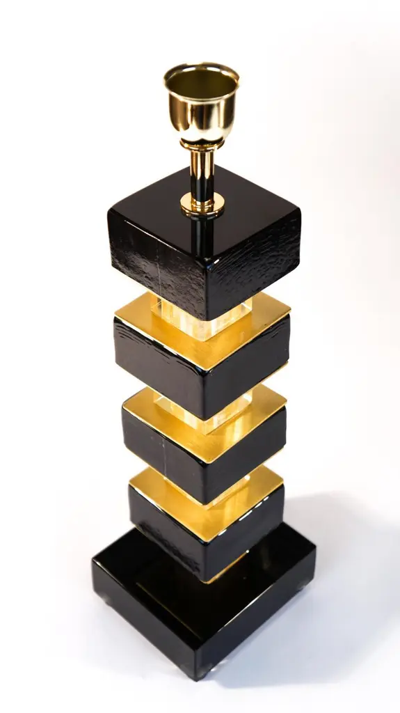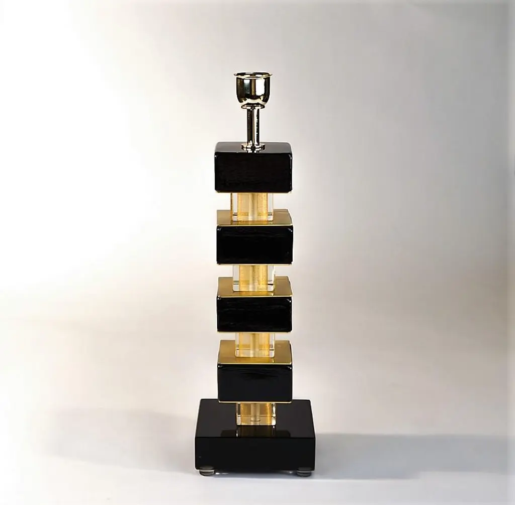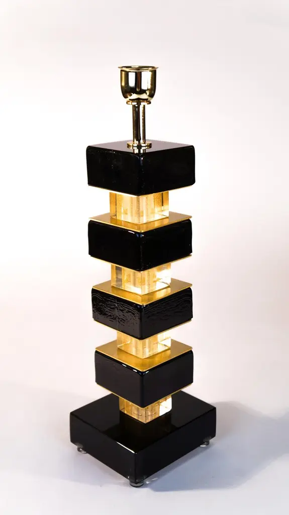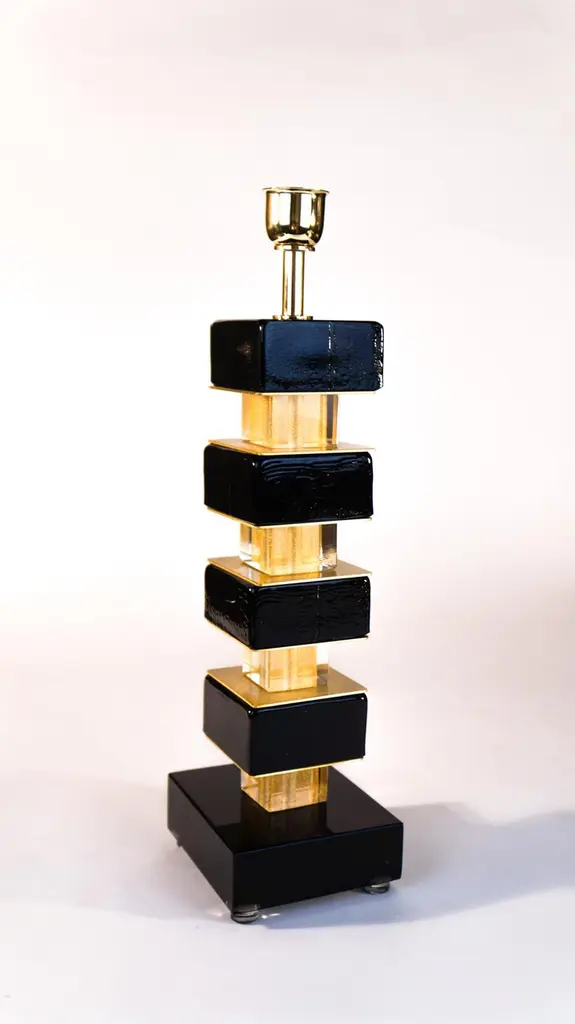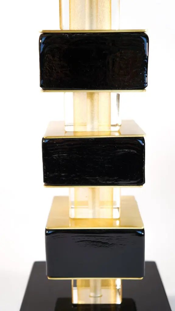 This is a very simple lamp, and because of its simplicity, it is certainly very elegant. Created by maestro Alberto Dona 'in 1980, it is embellished with 24-karat gold inserts that alternate with black blocks making the body of this lamp extremely refined.The products are entirely handmade in style Mid-Century Modern.Signature on the base by Alberto Donà Murano.The price of the item includes professional and tailored packing.Complexity is the hallmark of Murano glass lamps. The sheer beauty it radiates in any room in marvel-worthy.