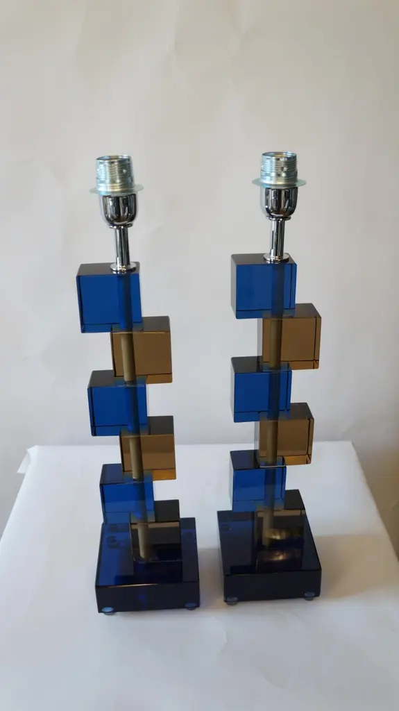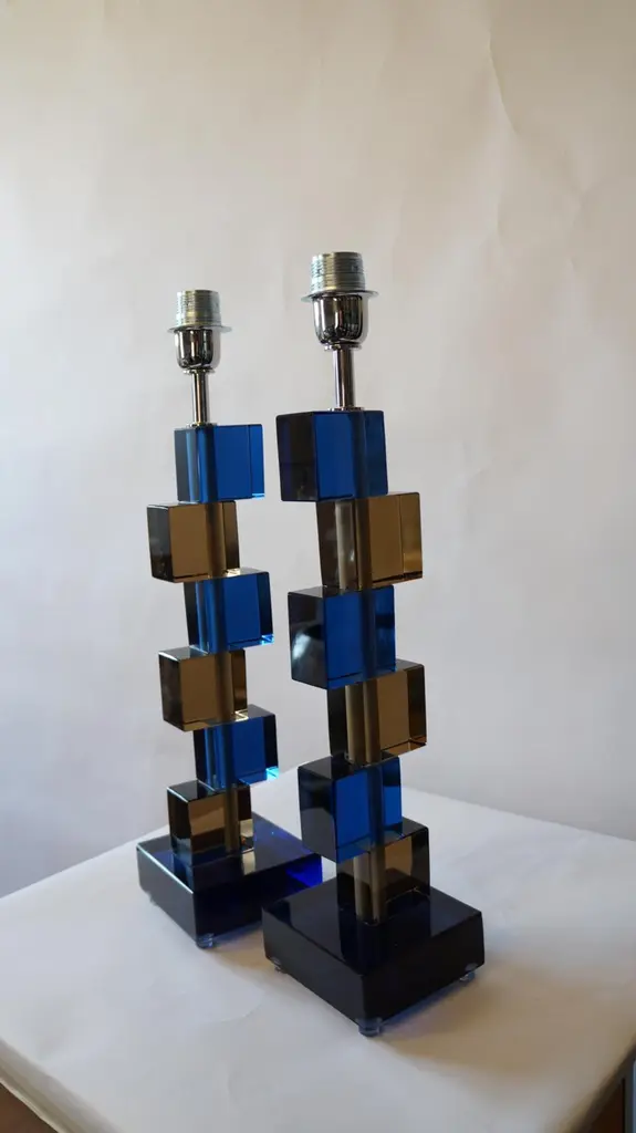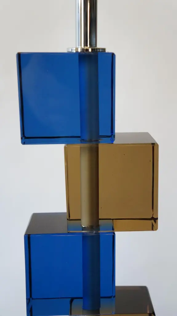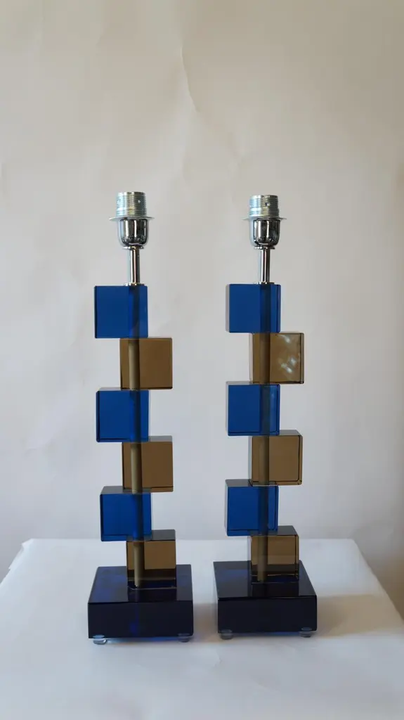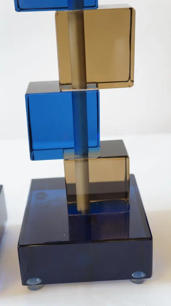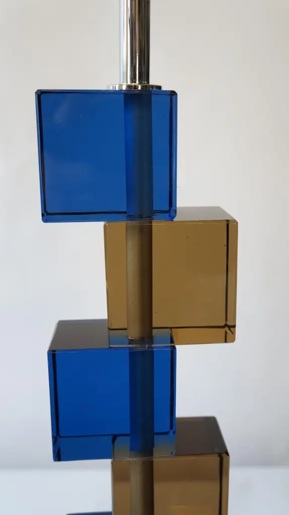 Alberto Donà in 1975 produced this beautiful lamp. In it we can see simplicity, elegance, linearity. It is, in fact, a simple model, and it is thanks to its colors that its beauty stands out. We note in fact the combination of blue and smoke, almost complementary colors, which give a thin layer of extravagance to this lamp. It extends in height up to 55.5 cm, and rests its "colored blocks" in a square base, black, 13.5 x 13.5 wide.The products are entirely handmade in style Mid-Century ModernThe price of the item includes professional and tailored packing.Lamps can be rewired for your country code.