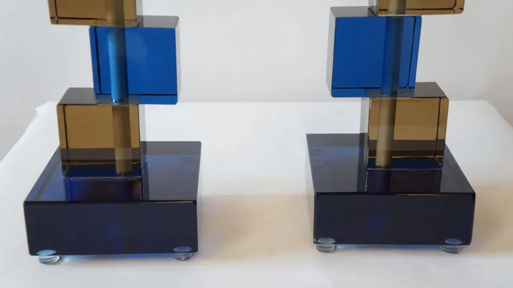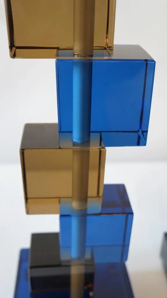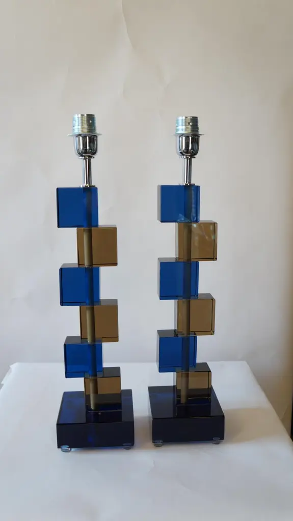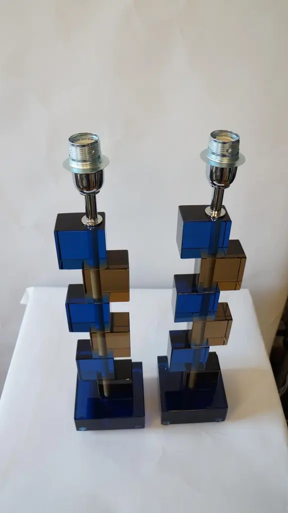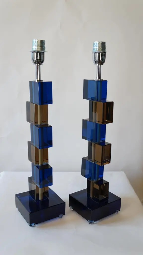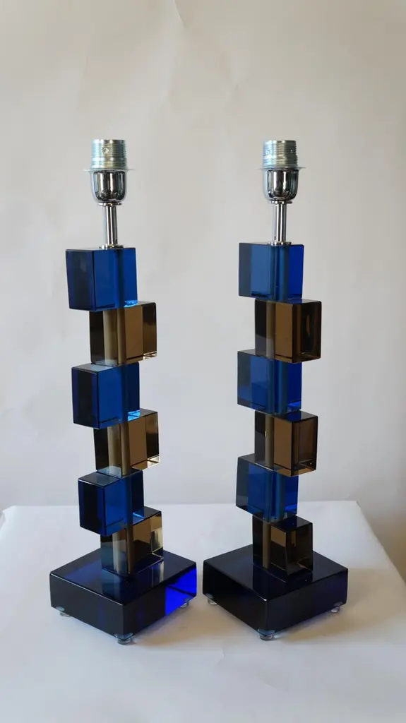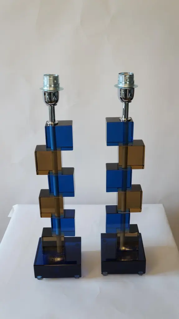 Alberto Donà in 1975 produced this beautiful lamp. In it we can see simplicity, elegance, linearity. It is, in fact, a simple model, and it is thanks to its colors that its beauty stands out. We note in fact the combination of blue and smoke, almost complementary colors, which give a thin layer of extravagance to this lamp. It extends in height up to 55.5 cm, and rests its "colored blocks" in a square base, black, 13.5 x 13.5 wide.The products are entirely handmade in style Mid-Century ModernThe price of the item includes professional and tailored packing.Lamps can be rewired for your country code.