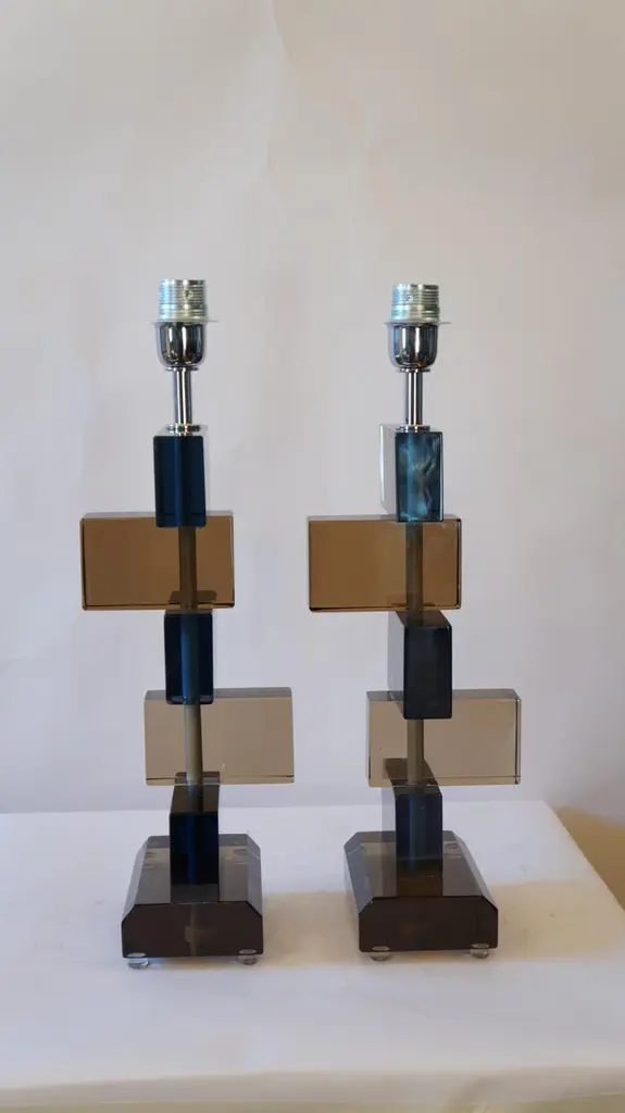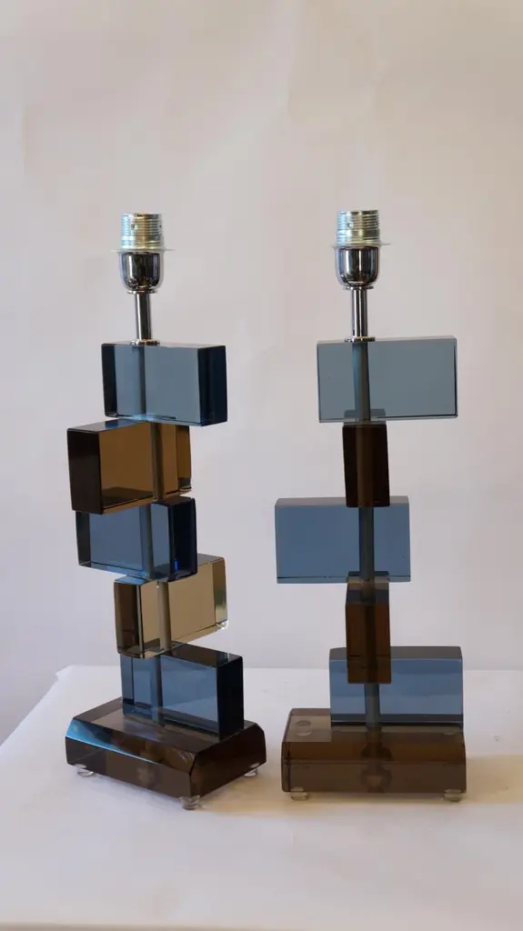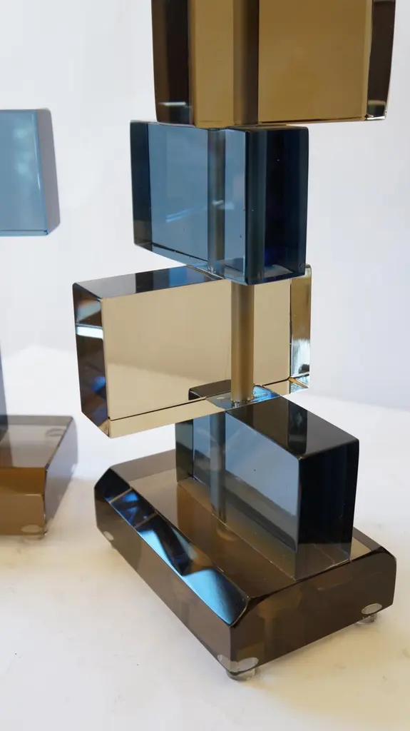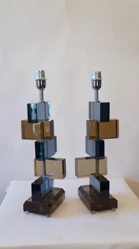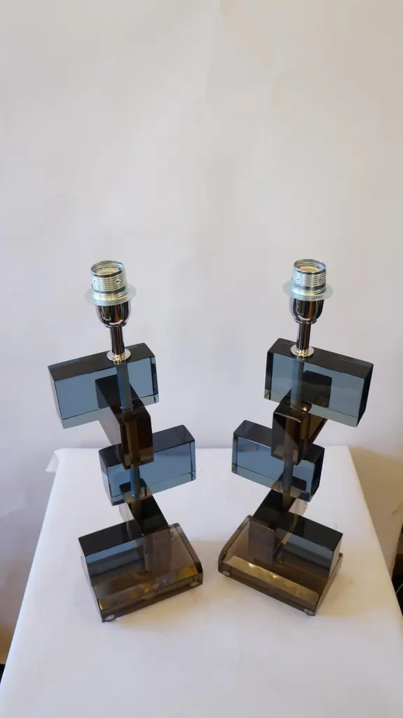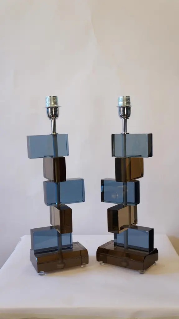 Two Murano glass table lamps by Alberto Donà in 1975.In it we can see simplicity, elegance, linearity. It is, in fact, a simple model, and it is thanks to its colors that its beauty stands out.We note in fact the combination of blue and smoky, almost complementary colors, which give a thin layer of extravagance to this lamp. It extends in height up to 52 cm, and rests its "colored blocks" in a rectangular base, 17 cm wide.The products are entirely handmade in style Mid-Century ModernThe price of the item includes professional and tailored packing.Lamps can be rewired for your country code.Engraved signature of the Master Glassmaker!