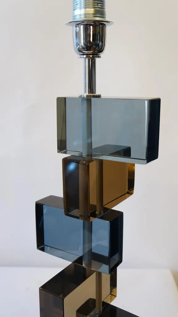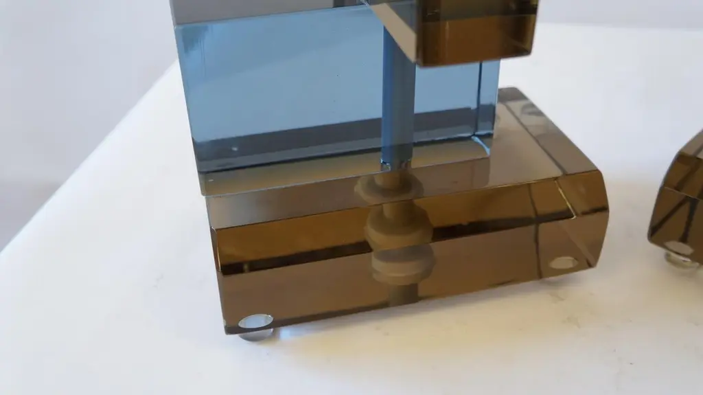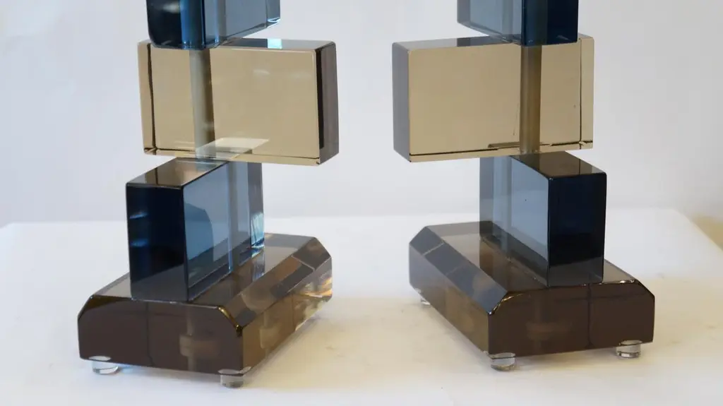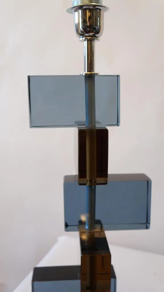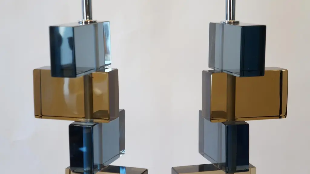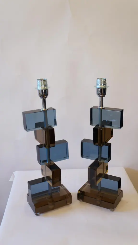 Two Murano glass table lamps by Alberto Donà in 1975.In it we can see simplicity, elegance, linearity. It is, in fact, a simple model, and it is thanks to its colors that its beauty stands out.We note in fact the combination of blue and smoky, almost complementary colors, which give a thin layer of extravagance to this lamp. It extends in height up to 52 cm, and rests its "colored blocks" in a rectangular base, 17 cm wide.The products are entirely handmade in style Mid-Century ModernThe price of the item includes professional and tailored packing.Lamps can be rewired for your country code.Engraved signature of the Master Glassmaker!