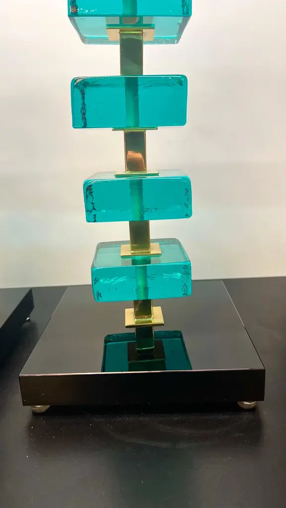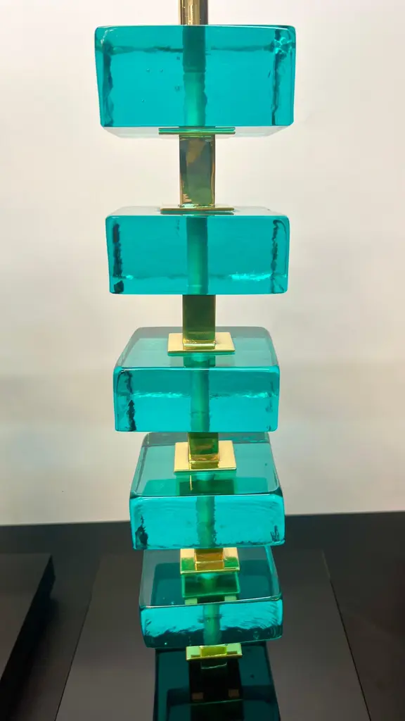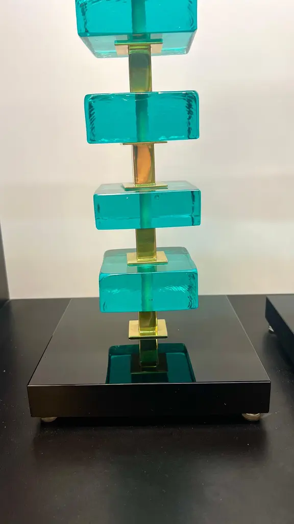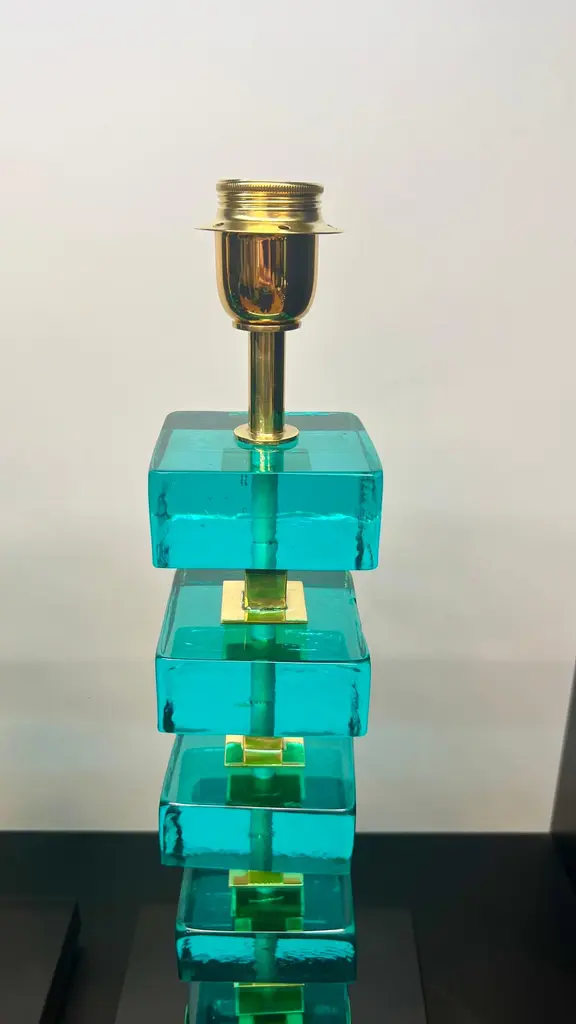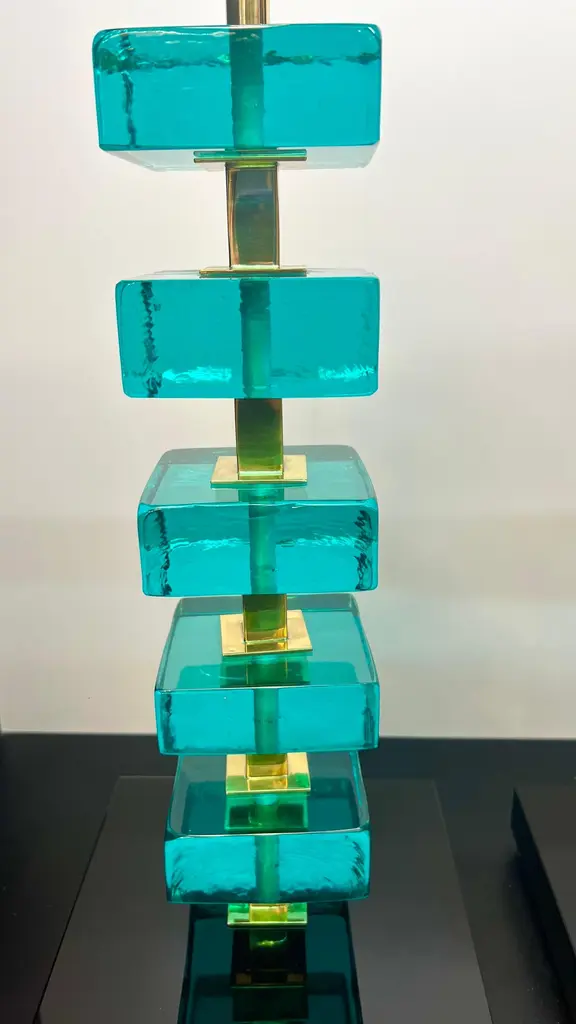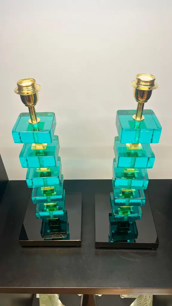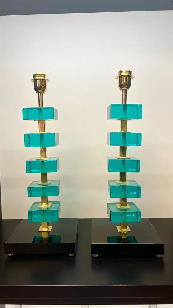 Exclusive pair of Marine Green Murano Glass table lamps with satin bronze frame.The lamp has 5 blocks of marine green color.Lamp made with great care and precision by our master glassmaker Alberto Donà of Murano.The products are entirely handmade in the Mid-Century Modern style.Project by the master glassmaker of Murano Alberto Donà in 2024.The size of the glass alone is 43cm (16.92 inches) high and 9 cm (3.54 inches) wide.The whole size of the lamp is 52cm (22.04 inches).E26/E27 bulb connection.Complexity is the hallmark of Murano glass lamps. The sheer beauty that radiates into any room is wonderful.The price of the item includes professional and tailor-made packaging.The lamps can be rewired for your country code.