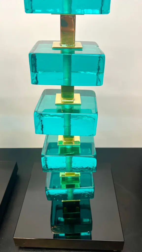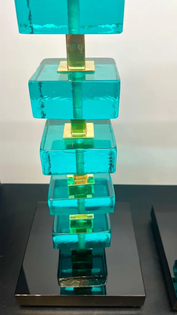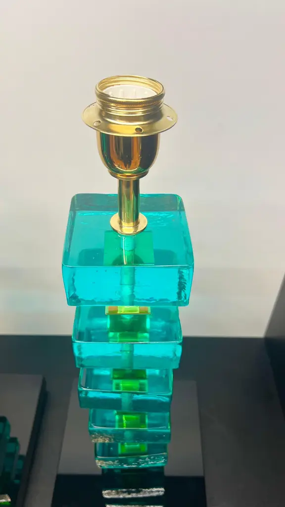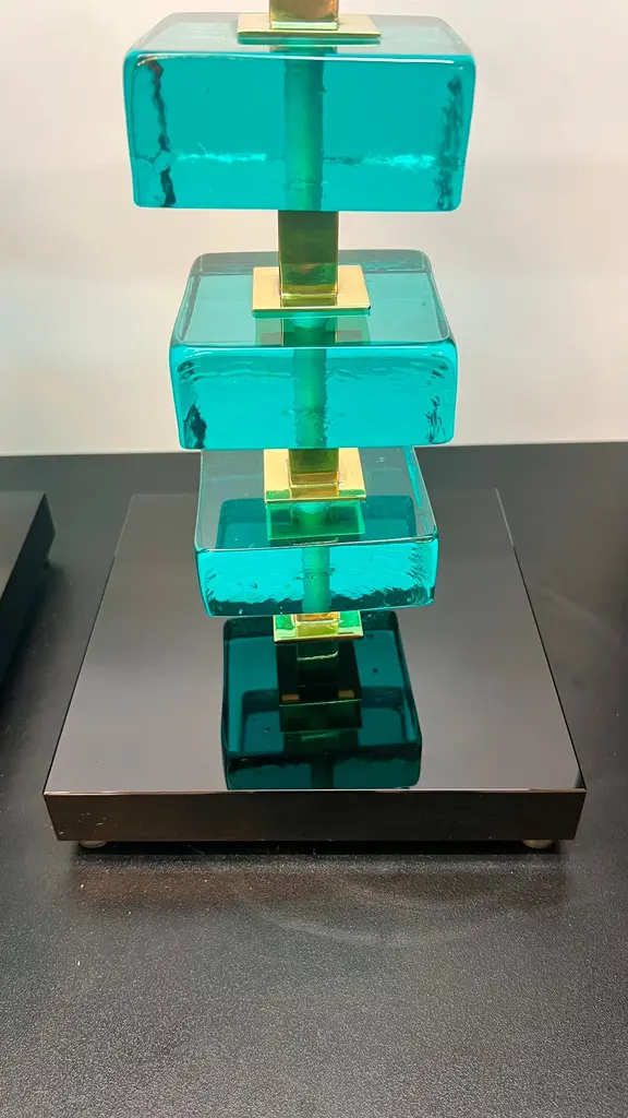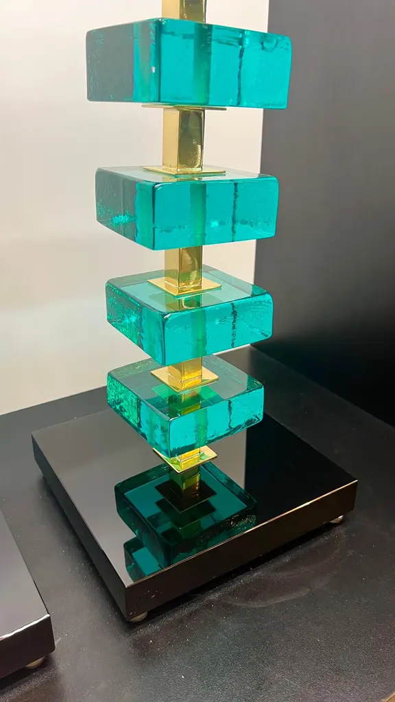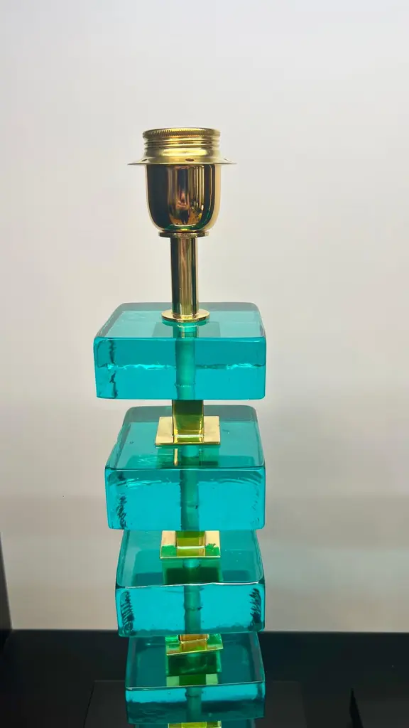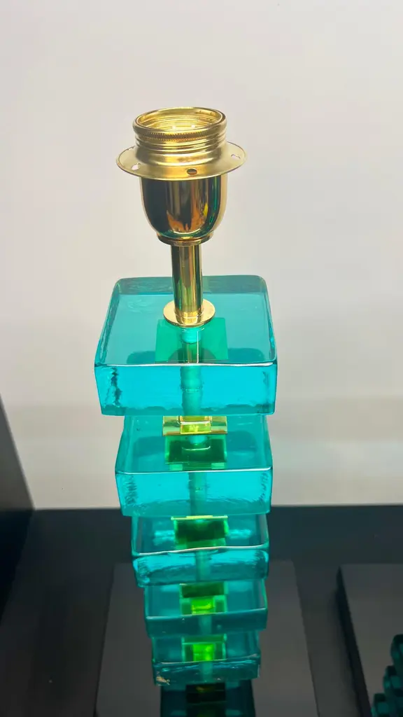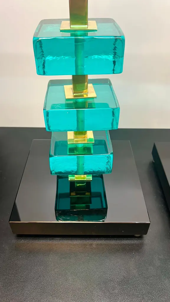 Exclusive pair of Marine Green Murano Glass table lamps with satin bronze frame.The lamp has 5 blocks of marine green color.Lamp made with great care and precision by our master glassmaker Alberto Donà of Murano.The products are entirely handmade in the Mid-Century Modern style.Project by the master glassmaker of Murano Alberto Donà in 2024.The size of the glass alone is 43cm (16.92 inches) high and 9 cm (3.54 inches) wide.The whole size of the lamp is 52cm (22.04 inches).E26/E27 bulb connection.Complexity is the hallmark of Murano glass lamps. The sheer beauty that radiates into any room is wonderful.The price of the item includes professional and tailor-made packaging.The lamps can be rewired for your country code.