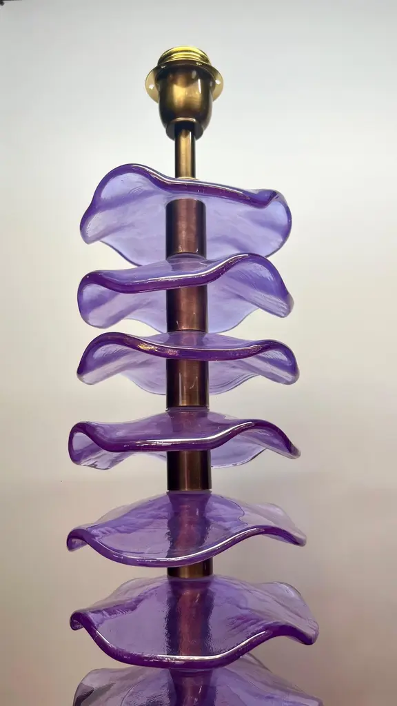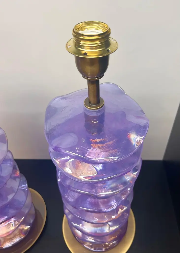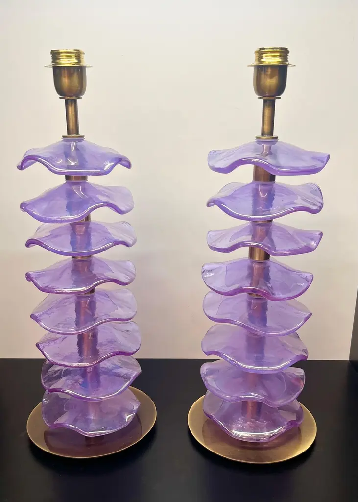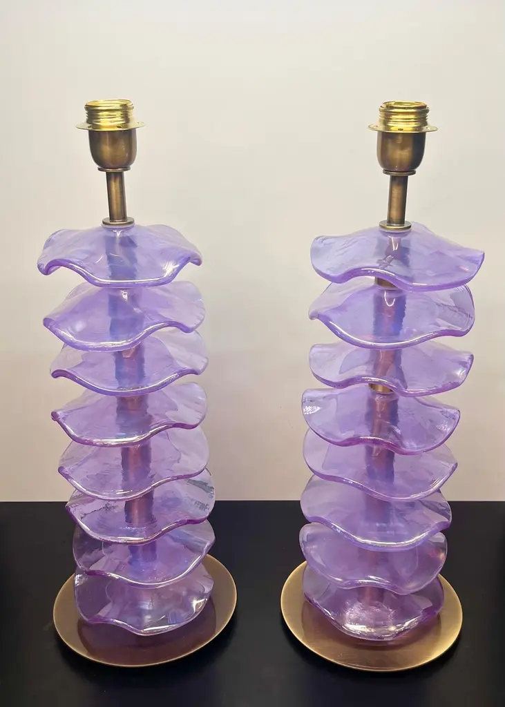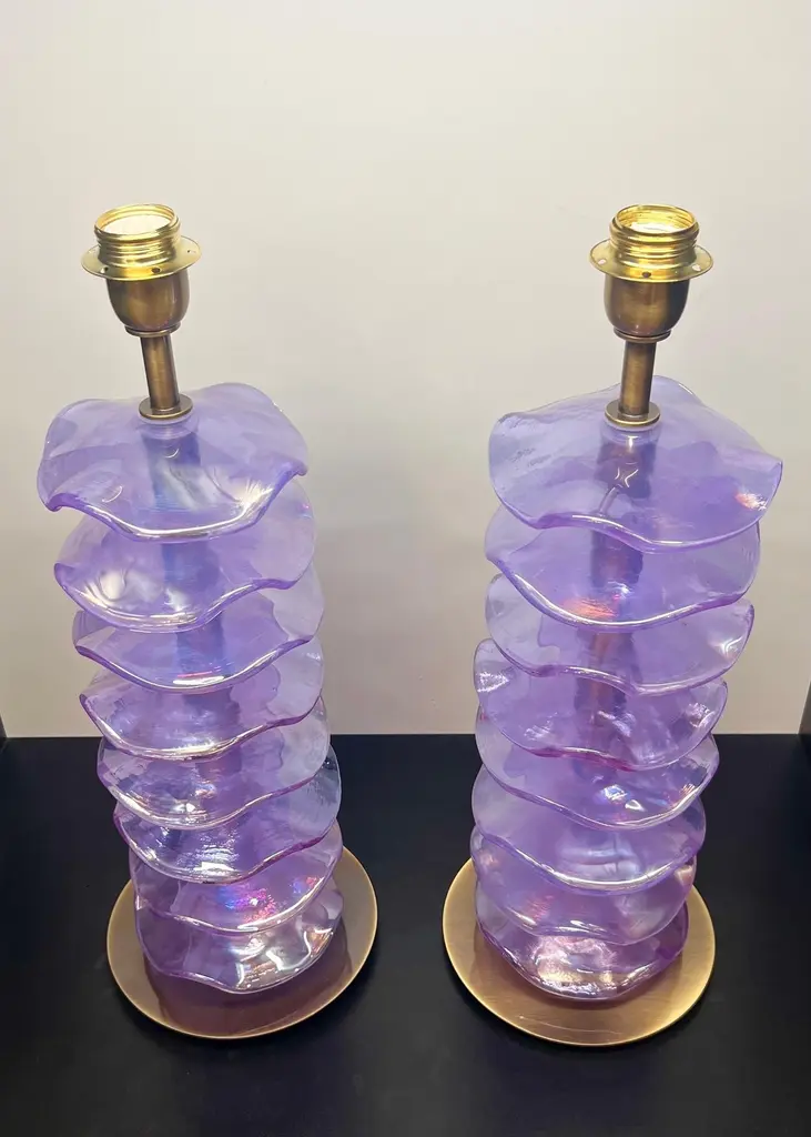 Exclusive pair of Purple Murano Glass table lamps with satin bronze frame.The lamp has 8 elements of a wavy circular shape in a mirrored purple colour.Lamp made with great care and precision by our master glassmaker Alberto Donà of Murano.The products are entirely handmade in the Mid-Century Modern style.Project by the master glassmaker of Murano Alberto Donà in 2024.The size of the glass alone is 45cm (17.71 inches).The whole size of the lamp is 56cm (22.04 inches).E26/E27 bulb connection.Complexity is the hallmark of Murano glass lamps. The sheer beauty that radiates into any room is wonderful.The price of the item includes professional and tailor-made packaging.The lamps can be rewired for your country code.