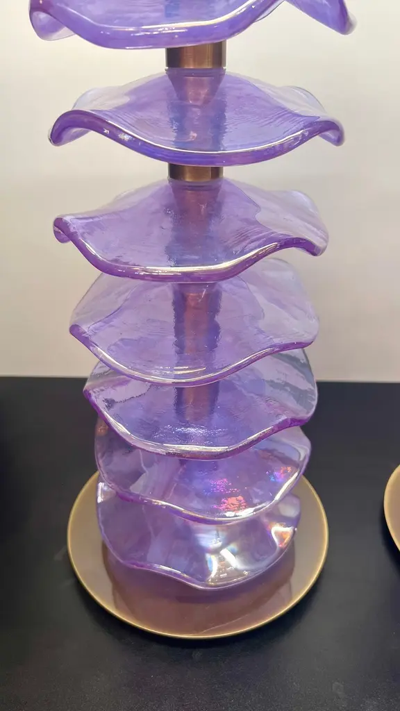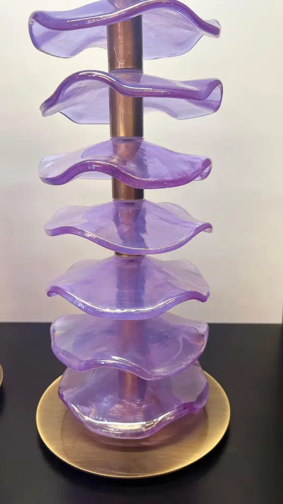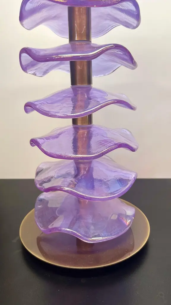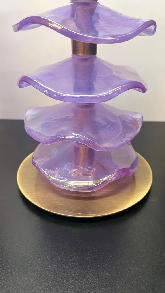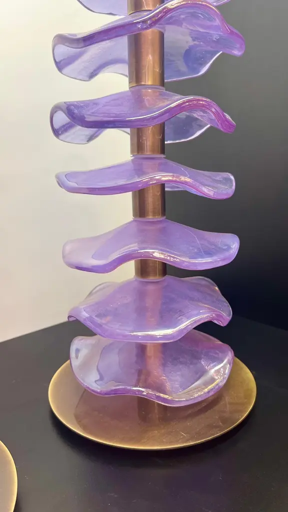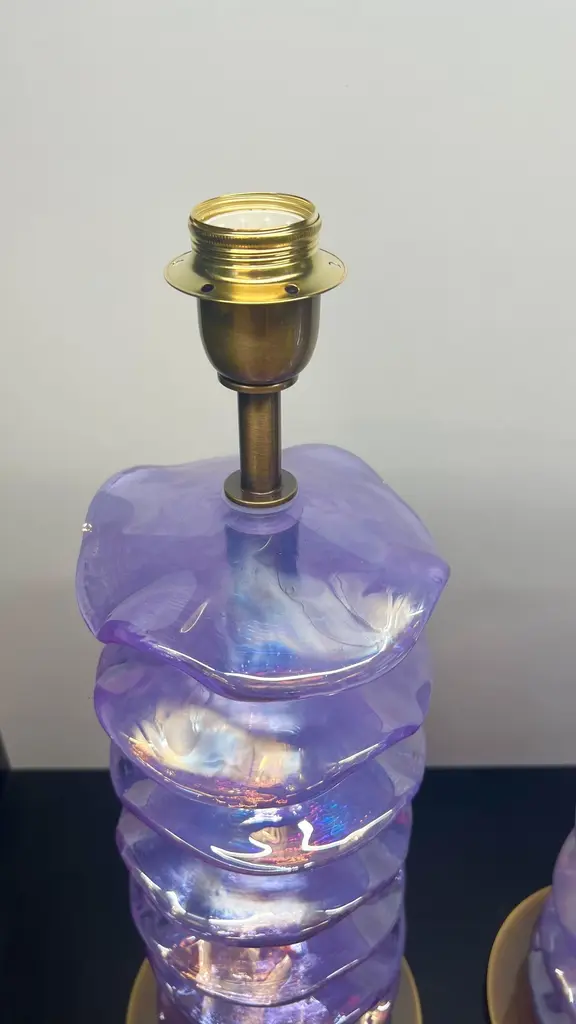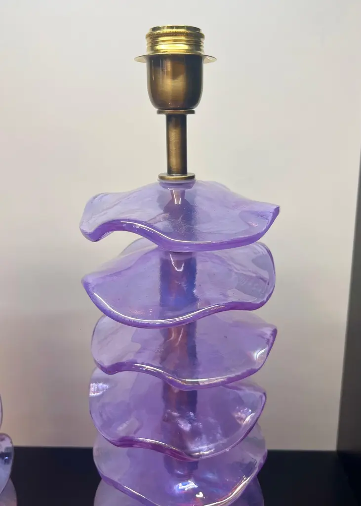 Exclusive pair of Purple Murano Glass table lamps with satin bronze frame.The lamp has 8 elements of a wavy circular shape in a mirrored purple colour.Lamp made with great care and precision by our master glassmaker Alberto Donà of Murano.The products are entirely handmade in the Mid-Century Modern style.Project by the master glassmaker of Murano Alberto Donà in 2024.The size of the glass alone is 45cm (17.71 inches).The whole size of the lamp is 56cm (22.04 inches).E26/E27 bulb connection.Complexity is the hallmark of Murano glass lamps. The sheer beauty that radiates into any room is wonderful.The price of the item includes professional and tailor-made packaging.The lamps can be rewired for your country code.