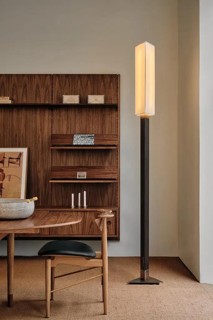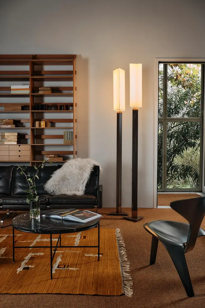 Aldebaran, the brightest star of Taurus, has given inspiration for a strong light source, placed on a highly prismatic column of precious Macassar wood, supported by a triangle patinated bronze base. The prismatic form of the lampshade completes the composition. The irregular lines of the silk jacquard fabric break the satin sheen background like small waves on still water. European Plug (up to 250V).