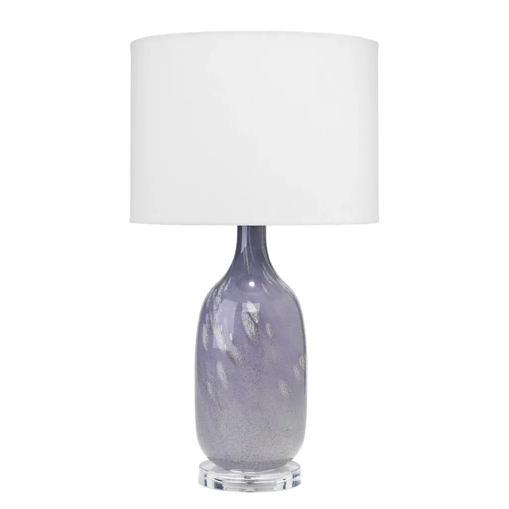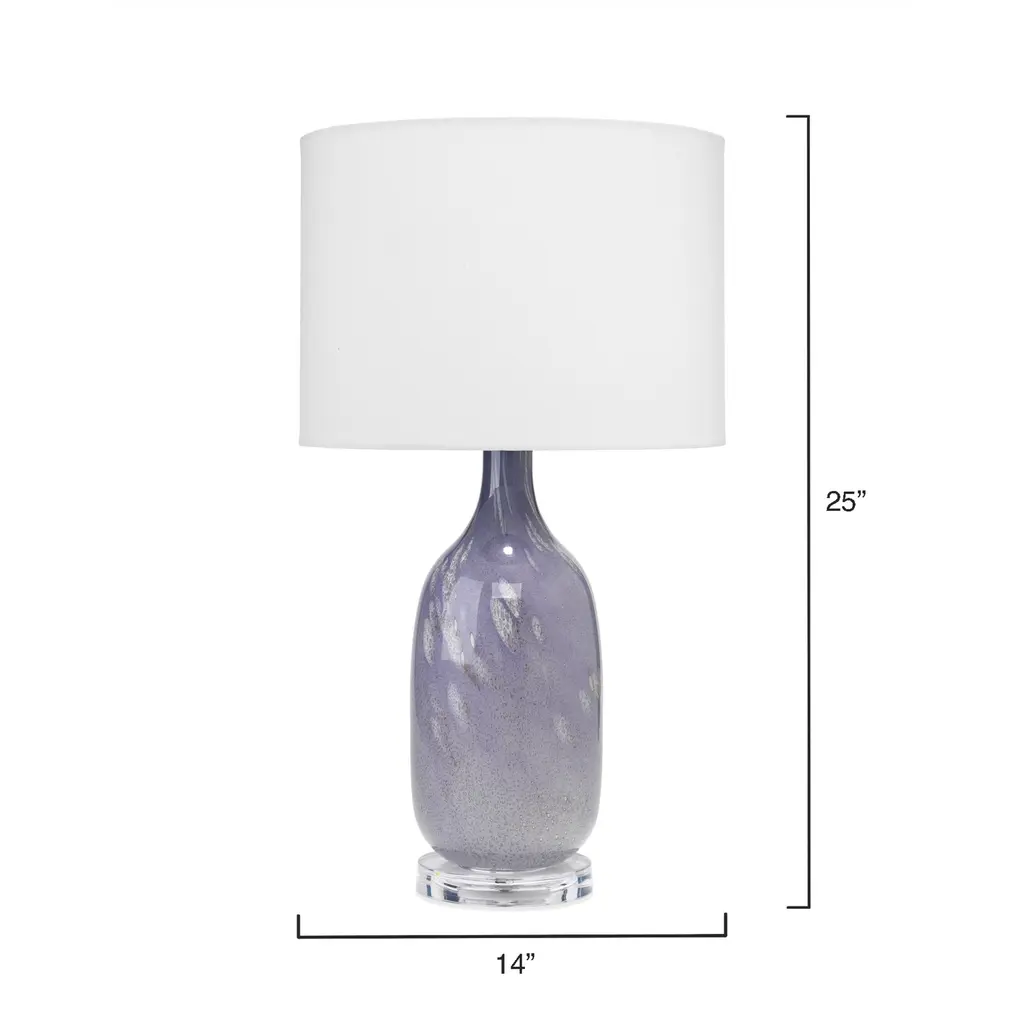 Brighten any room with the etheral hues of this accent lamp. Its handblown glass features a lavender finish with silver highlights and rests on an acrylic base. Balanced with a linen drum shade for a soft contrast and refined glow. •Made of hand-blown glass•100% Off-white Linen Drum Shade•Acrylic Base •Clear Crystal Ball FinialCrafted of hand-blown glass, this lamp will feature subtle markings and variations in tone. These unique imperfections and variations are what define our products, with each piece having its own personality. •Lamp Dimensions: 15"H x 6"W X 6"D• Shade Dimensions: 10"H x 14"W x 14"D• 1 bulb required; Bulb Not Included• 150 Max Wattage; 120 Volts• E26 Bulb Base Type • 8 Ft Clear Cord• 3-way Switch We do not recommend using harsh or abrasive cleaners at any time as they can damage product. Wipe surfaces gently with soft, dry cloth. If needed, you may use a lightly damp cloth with water only on base.