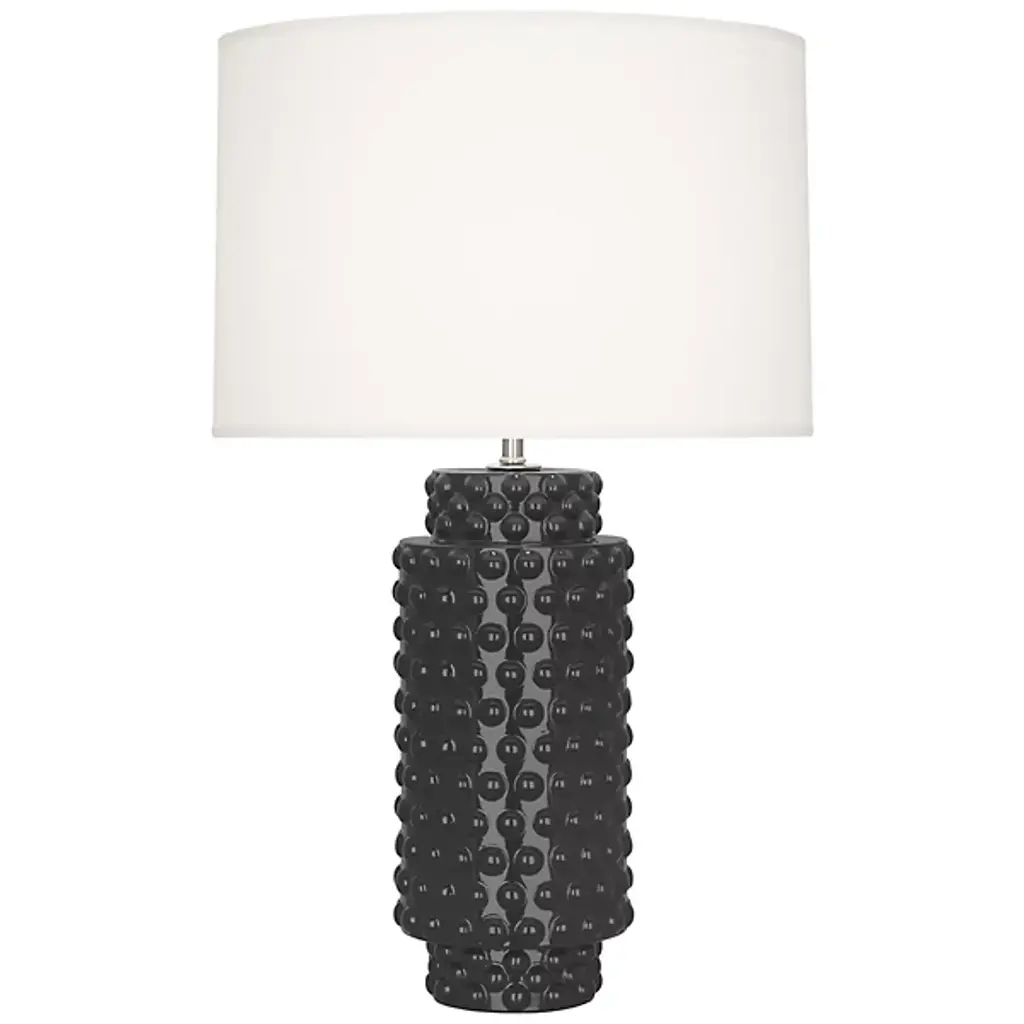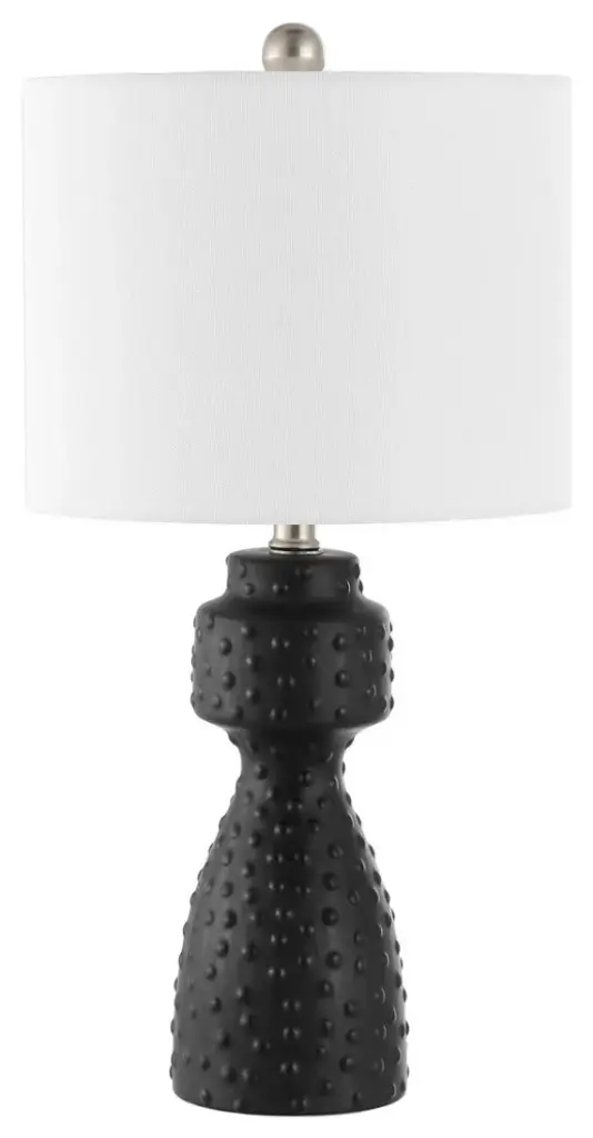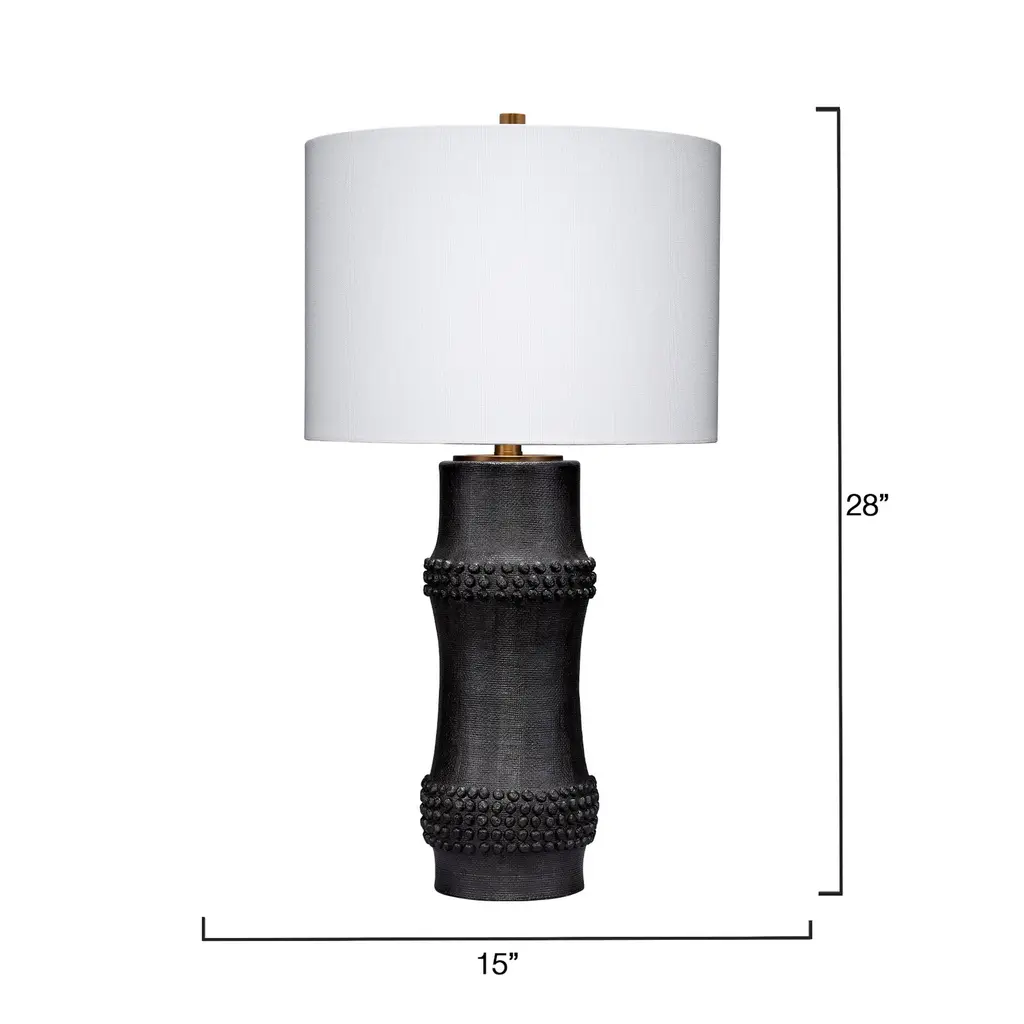 A clean, contemporary take on a classic, the body of this lamp is a minimalistic interpretation of bamboo cane. Ours is unadorned but for a few carefully placed beaded embellishments. The lamps are each handcrafted of resin, with small splashes of brass courtesy of the metal hardware and finial. A white linen drum shade is included. •Handmade of Polyresin•Drum Shade, 100% White Linen, Rolled Edge•Dotted Textured Base•1"H Metal Cylinder Brass Finial•9" Brass Harp, Brass SpiderThe handcrafted nature of resin creates products with character and individuality. The variations in tone and texture are preserved, to create pieces rich in detail and natural beauty. These unique imperfections and variations are what define our products, with each piece having its own personality. •Lamp Dimensions: 16"H x 6.25"W x 6.25"D• Shade Dimensions: 10.5"H x 15"W x 15" D, Top Diameter 15" • 1 bulb required; Bulb Not Included• 150 Max Wattage, Volts 110• E26 Bulb Base Type • 8 FT Clear Cord • 3-Way Switch on Socket• Protective Black Felt• Not Damp Rated We do not recommend using harsh or abrasive cleaners at any time as they can damage product. Wipe surfaces gently with soft, dry cloth. If needed, you may use a lightly damp cloth with water only on base.