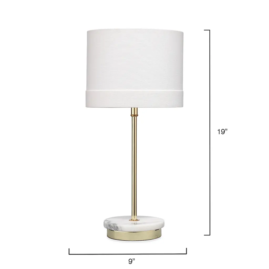 A graceful contemporary lamp with a marble and brass base that give it glamour and dimension, paired with a drum cotton shade with bold bottom band makes for the perfect modern accent lamp •Made of Iron in Antique Brass Finish •100% Linen White Drum Shade•Natural Marble Accent Base•UNO Socket; No Harp/FinialThe handcrafted nature of marble creates products with character and individuality. The inherent variations in tone, texture and pattern, are preserved, to create pieces rich in detail and natural beauty. These unique imperfections and variations are what define our products, with each piece having its own personality. •Lamp Dimensions: 12"H x 5.5" Diameter Footprint• Shade Dimensions: 7"H x 9"W x 9"D• 1 bulb required; Bulb Not Included• 40 Max Wattage; 120 Volts• E26 Bulb Base Type • 8 Ft Clear Cord• 1-way Switch Do not use harsh or abrasive cleaners at any time as they can damage finish. Wipe surfaces gently with soft, dry cloth. If need, you may use a lightly damp cloth with water only.