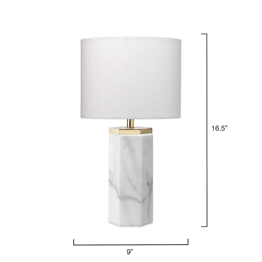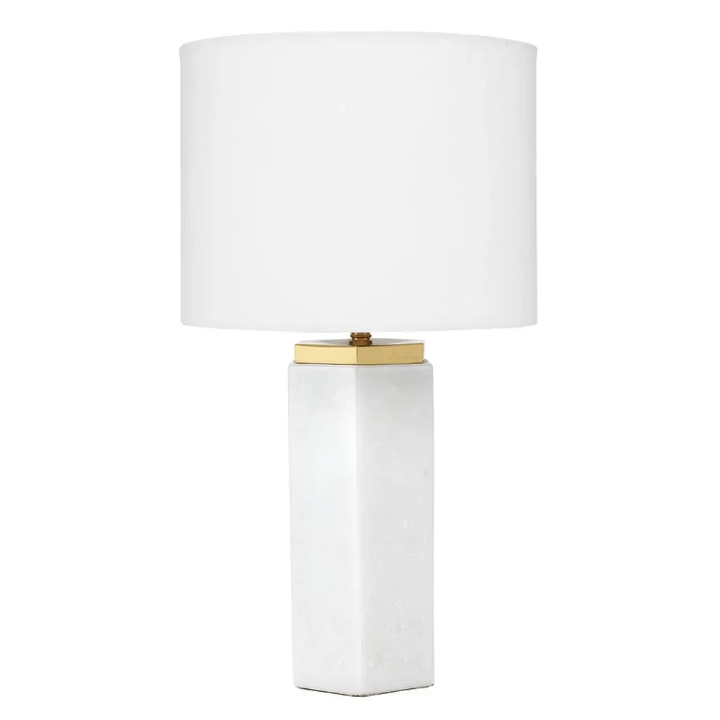 Introduce a timeless touch to your interiors with this accent table lamp. The simple geometric form is hand-carved of white marble that's richly veined for subtle dimension and capped with brass. Topped with a linen drum shade offering tonal beauty that suits classic and contemporary settings alike. Features: •Hand-carved of Natural Marble•100% Linen White Drum Shade•Brass Accents•UNO Socket; No Harp/FinialThe handcrafted nature of marble creates products with character and individuality. The inherent variations in tone, texture and pattern, are preserved, to create pieces rich in detail and natural beauty. These unique imperfections and variations are what define our products, with each piece having its own personality. Specifications: •Lamp Dimensions: 8.5"H x 4"W X 4"D• Shade Dimensions: 7"H x 9"W x 9"D• 1 bulb required; Bulb Not Included• 40 Max Wattage; 120 Volts• E26 Bulb Base Type • 8 Ft Clear Cord• 1-way SwitchCare Instructions: Do not use harsh or abrasive cleaners at any time as they can damage finish. Wipe surfaces gently with soft, dry cloth. If need, you may use a lightly damp cloth with water only.