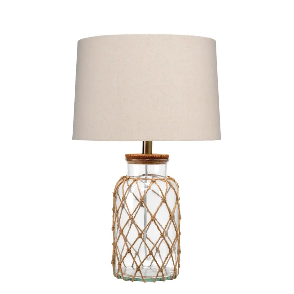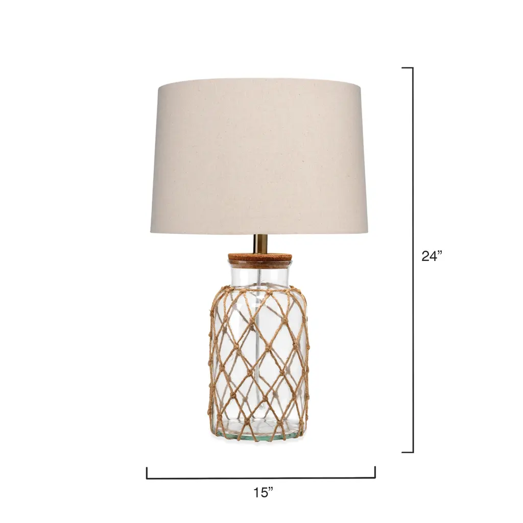 Add a natural accent to your interiors with this lamp. Made of blown-glass, the clear base is wrapped with a jute rope net. The cork top can be removed so that you can fill with your favorite beach finds. •Made of hand-blown glass•100% Taupe Linen Tapered Shade •Rope Net Base•Brown Ball Resin Finial•Wrapped in Natural Jute NetCrafted of hand-blown glass, this lamp will feature subtle markings and variations in tone. These unique imperfections and variations are what define our products, with each piece having its own personality. •Lamp Dimensions: 12.5"H x 6.5" Diameter Footprint• Shade Dimensions: 10"H x 15"W x 15"D, Top Diameter 14"• 1 bulb required; Bulb Not Included• 150 Max Wattage; 120 Volts• E26 Bulb Base Type • 8 Ft Clear Cord• 3-way Switch We do not recommend using harsh or abrasive cleaners at any time as they can damage product. Wipe surfaces gently with soft, dry cloth. If needed, you may use a lightly damp cloth with water only on base.