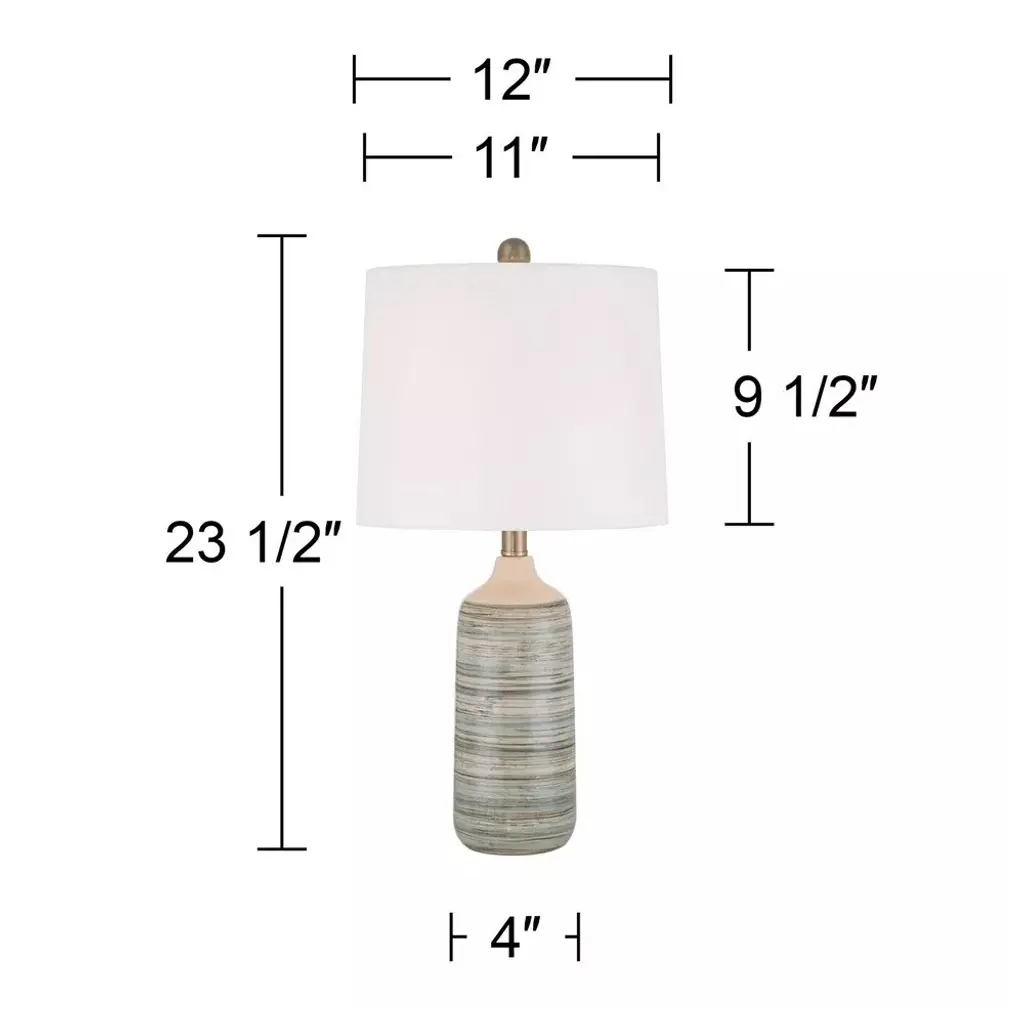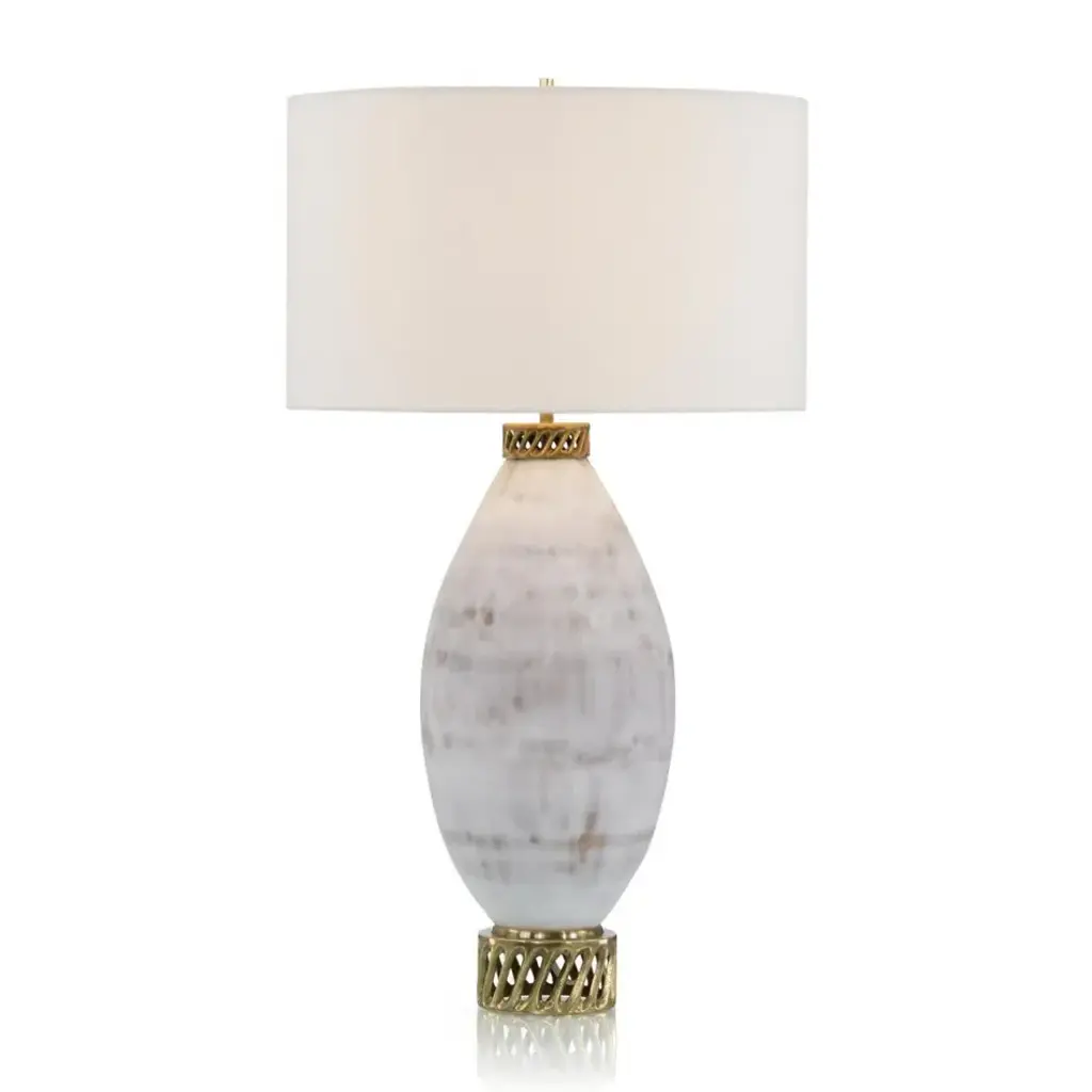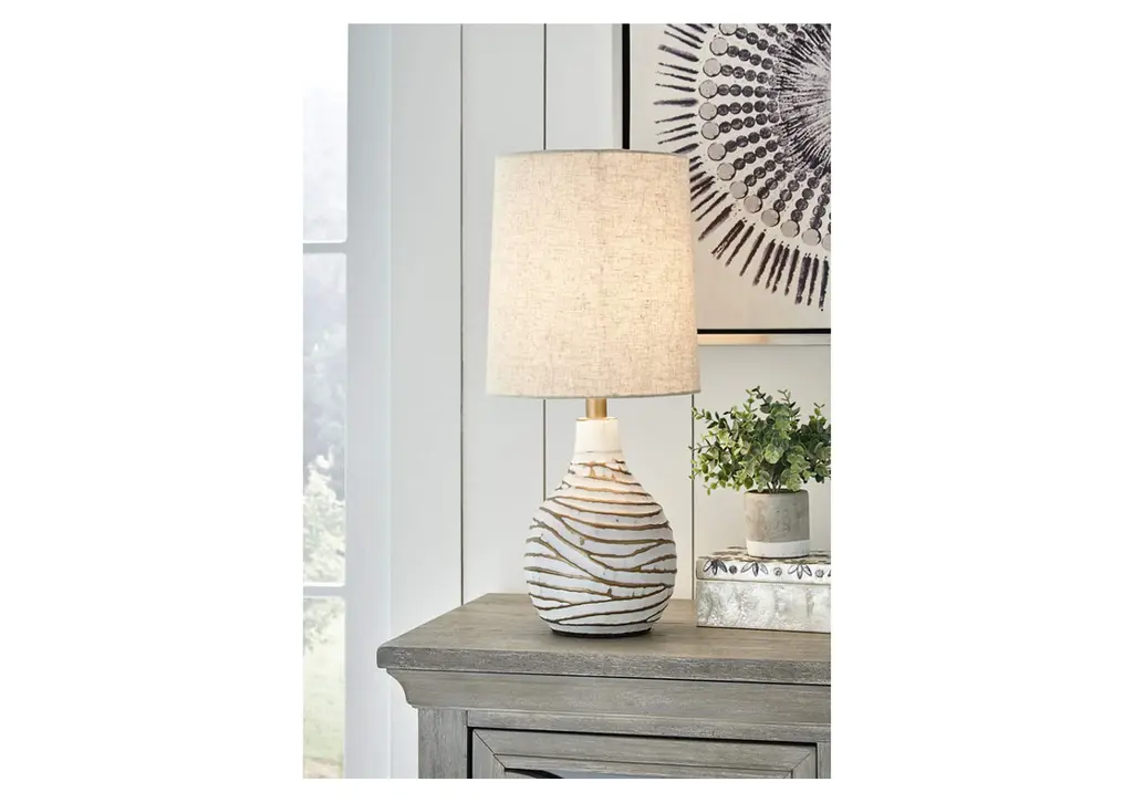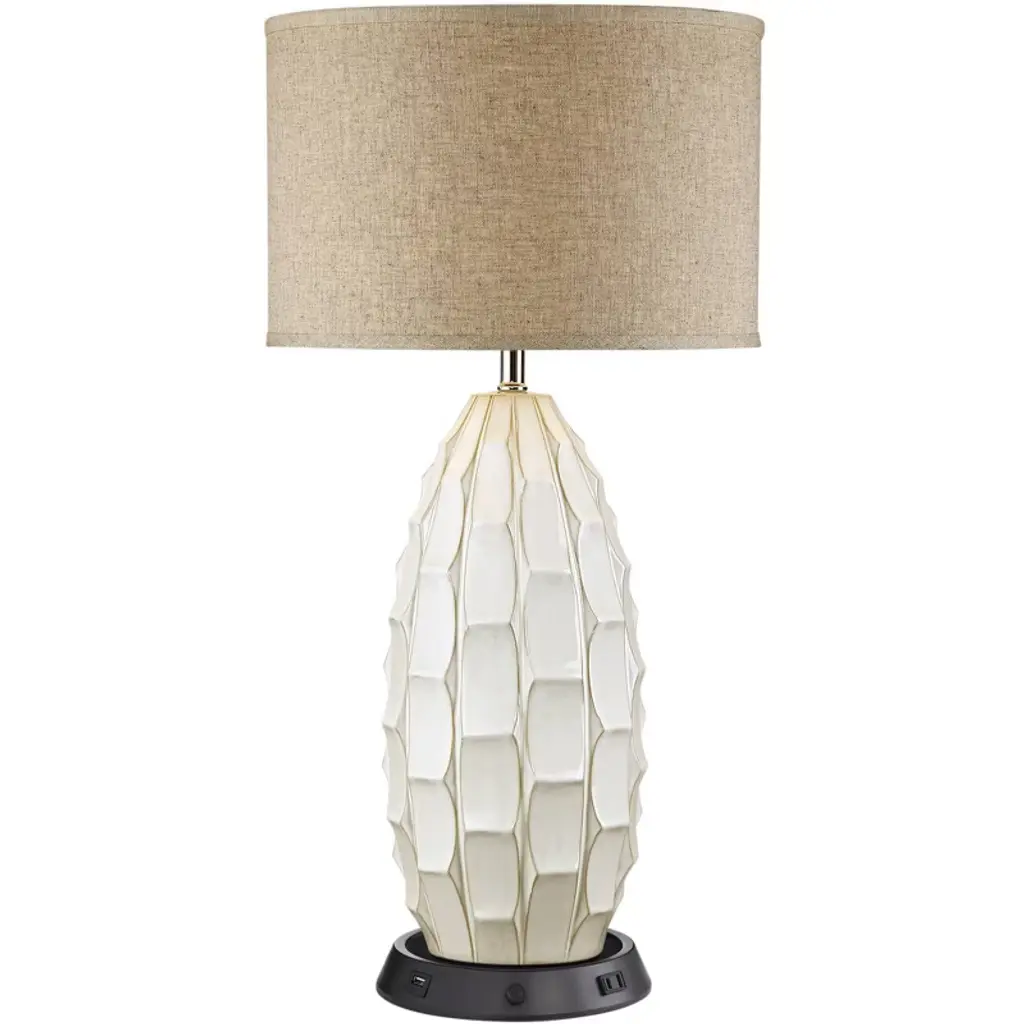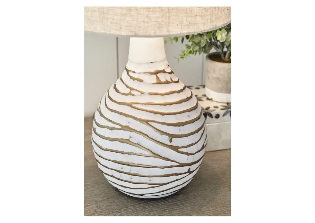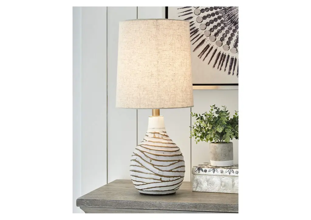 Shine a contemporary spotlight on your good taste with the Aleela table lamp. The antiqued white and goldtone finish of this metal lamp adds texture and interest to any space. With a modified drum shade, this light will illuminate your decor with style. Weight 6.000 lbs. (2.7kgs.)