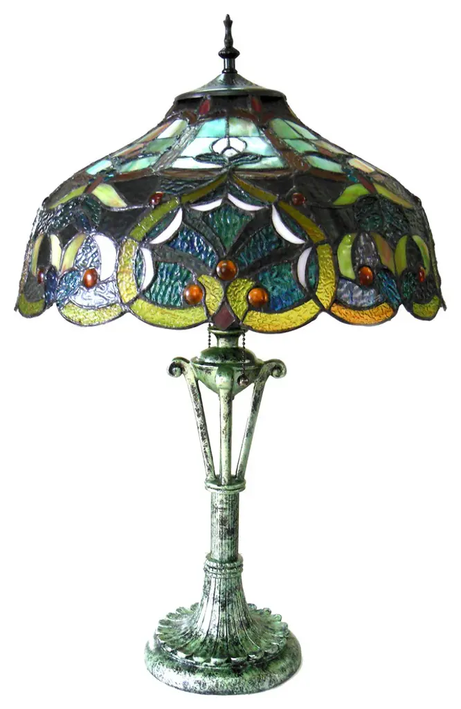 This Tiffany style Victorian design 2-light table lamp features a textured green finish that will complement many decors throughout your home. Hand crafted from individually hand cut of 500 pieces copper-Foiled stained glass and 51 beads that will add color and beauty to any space.(2) 100 Watt max E26 Type A Bulb (not included)Pull chain500pcs glass cut, 51 beadsDownlightIndoor SettingGlass &/or Fabric Color: Multi-coloredShape: RoundBulb Type: Incandescent; LED; Compact Fluorescent (CFL)Max Wattage: 100Bulb Base: E26/Medium (Standard)Bulb Shape: A19Additional Warning or Disclaimers: Since these are hand crafted products, the exact color of glass pieces may vary. Colors of the glass will appear darker and less vibrant when not illuminated. Handmade glass will vary from one piece to the other; glass made at different times will also vary. Light bulbs used in lamps or ambient lighting may affect the appearance of the products. Stained glass product has been protected with mineral oil as part of the finishing process. Please use a soft dry cloth to remove any excess oil.UL Certification #: E246443