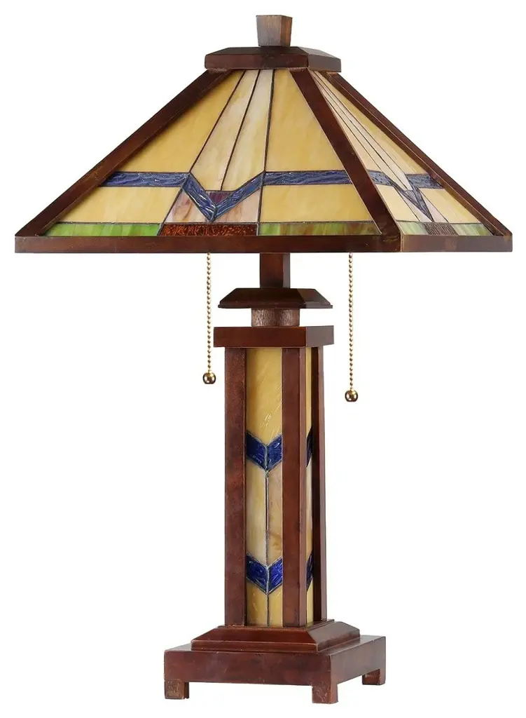 ALEXANDER, a Mission style lighted base wooden table lamp will provide the design focal point for your home. Expand the effect by adding one or more of the other lamps in this design style. Expertly handcrafted with top quality materials including real stained glass and rubber wood frame in dark walnut finish. The lighted base can be used alone whenever low light levels are desired.(2) 60 Watt max E26 Type A Bulb + 1-Max 25 Watt E12 Type C Bulb (Type A bulb not included) Pull chain & on-cord rotary switch100pcs glass cutDownlightIndoor SettingHarmonized code: 940520Since these are hand crafted products, the exact color of glass pieces may vary. Colors of the glass will appear darker and less vibrant when not illuminated. Handmade glass will vary from one piece to the other; glass made at different times will also vary. Light bulbs used in lamps or ambient lighting may affect the appearance of the products. Stained glass product has been protected with mineral oil as part of the finishing process. Please use a soft dry cloth to remove any excess oil.