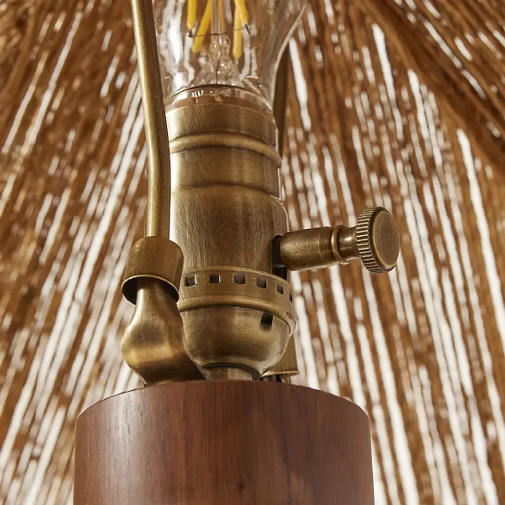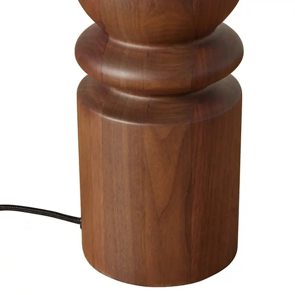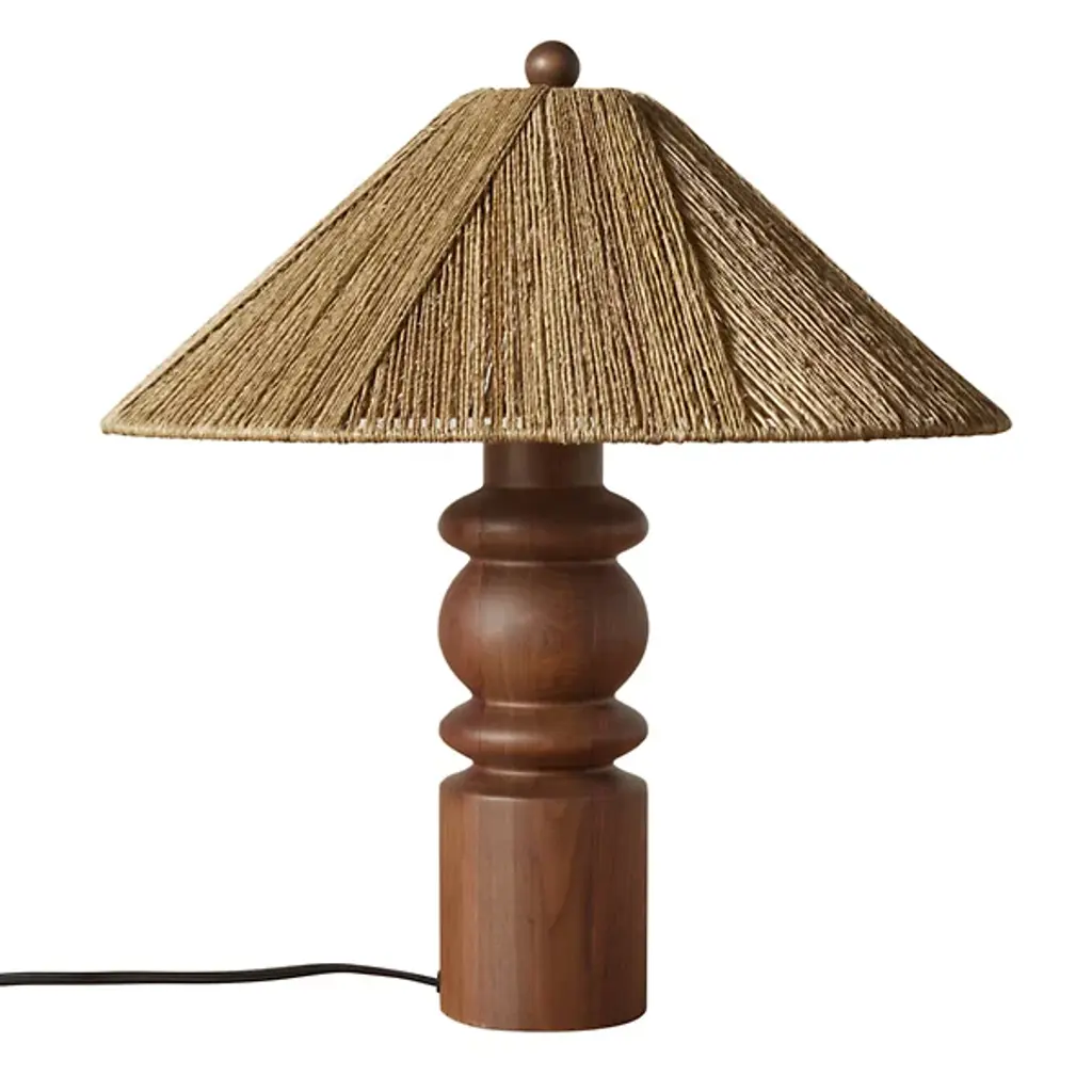 The Alhambra Table Lamp from Woven brings artisanal craftsmanship to tabletop lighting with its sculptural wooden base. The turned walnut profile transitions from a substantial circular foot to a series of perfectly proportioned beads that create visual rhythm. Topped with a woven jute shade that filters light beautifully, this table lamp adds natural texture to nightstands, side tables, or desks. The convenient turn knob makes operation intuitive, while the black fabric cord ensures a refined presentation from every angle.