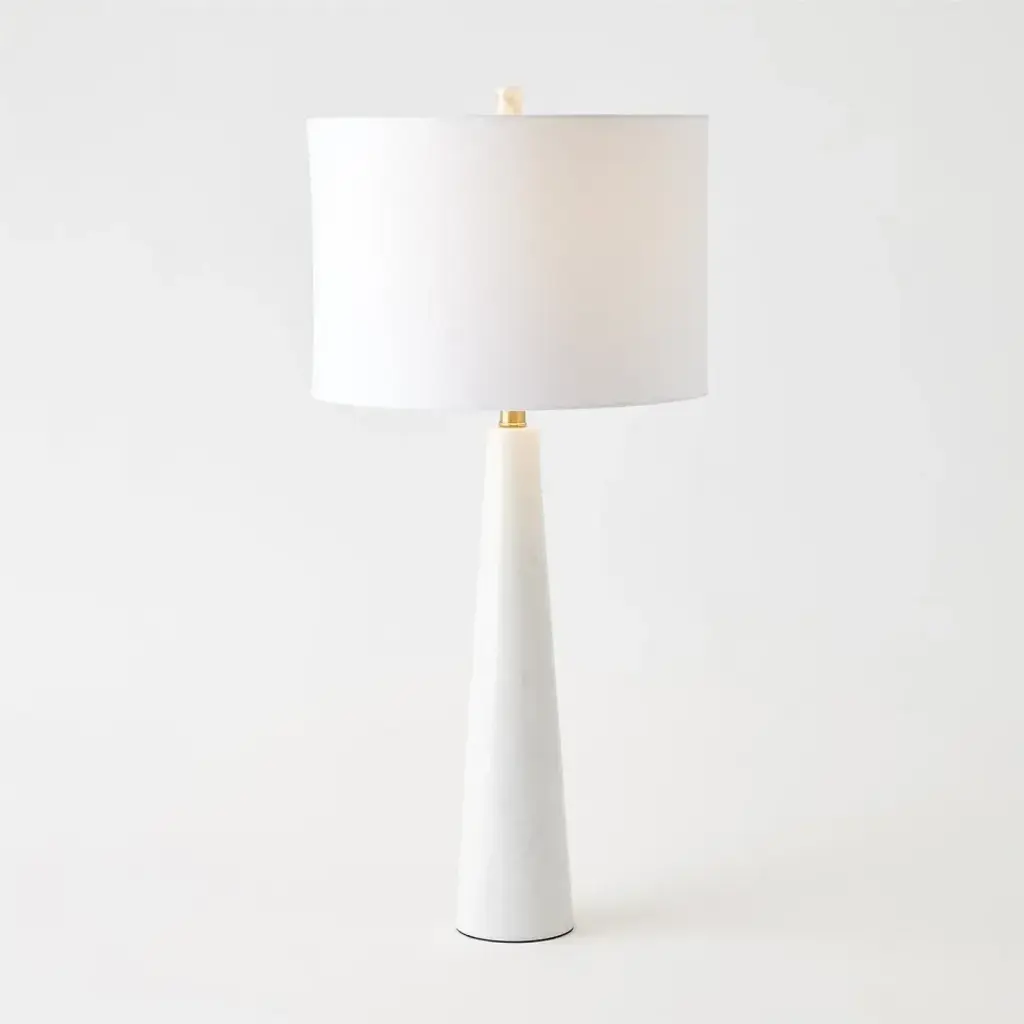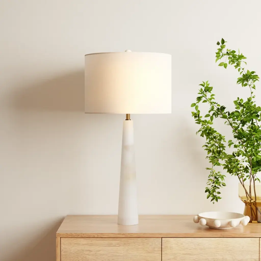 Illuminate any room in a clean, minimalist style with this table lamp. The base is made of alabaster stone that brings natural appeal and has a tapered, conical silhouette. Its small footprint only measures 4.25" at the bottom, so it won't take up too much space. The off-white cotton drum shade diffuses the light from the LED bulb throughout your space. We love how the bulb is included, saving you a trip to the store.