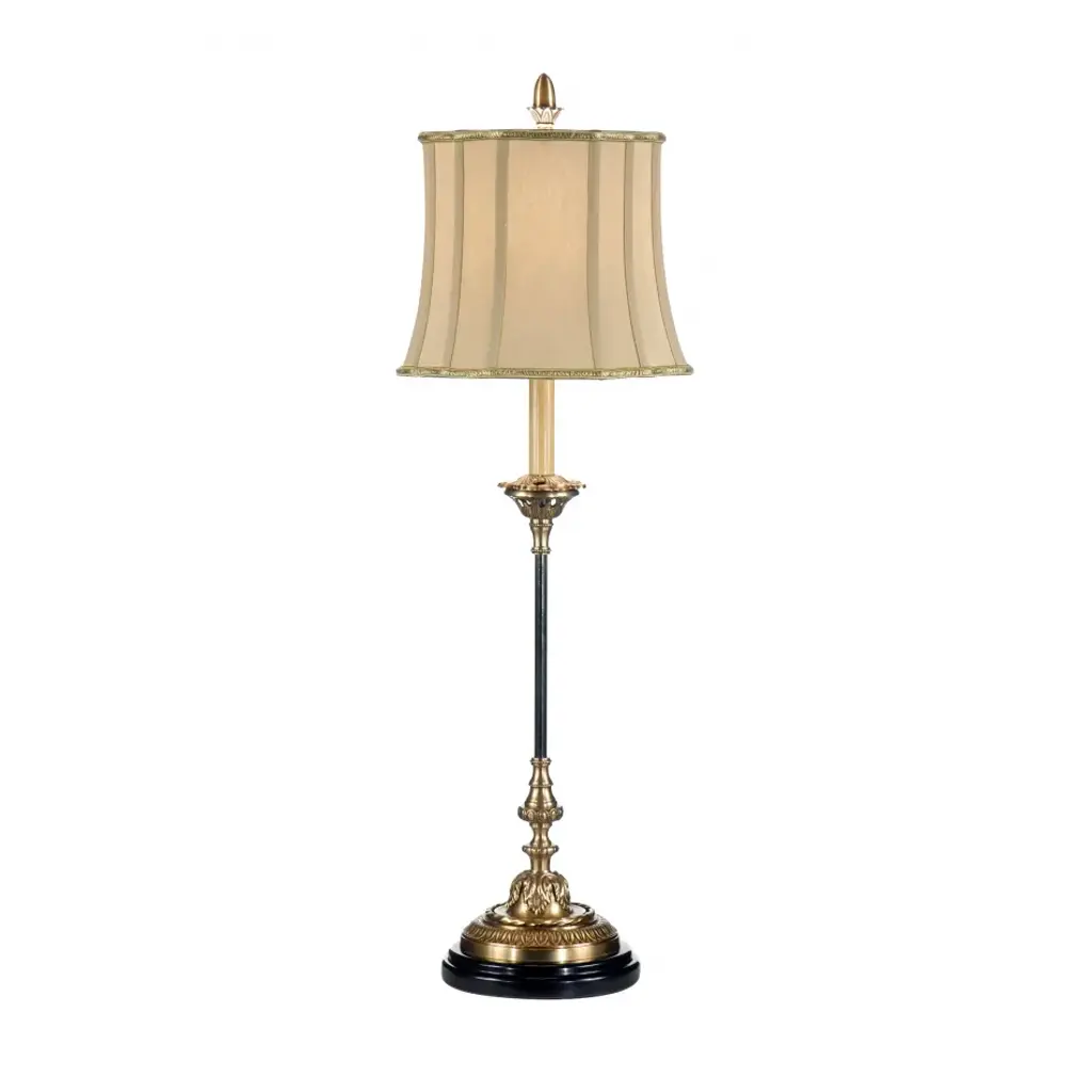 Part of a series of refined lighting fixtures to complement both modern and traditional interiors, this bedside table lamp will warm up the ambiance of a sophisticated bedroom. Handcrafted of antiquated brass decorated with fine metal details, it features a striking stem supporting an E14 LED lightbulb (max 40W) enclosed in a refined orange pleated fabric shade.