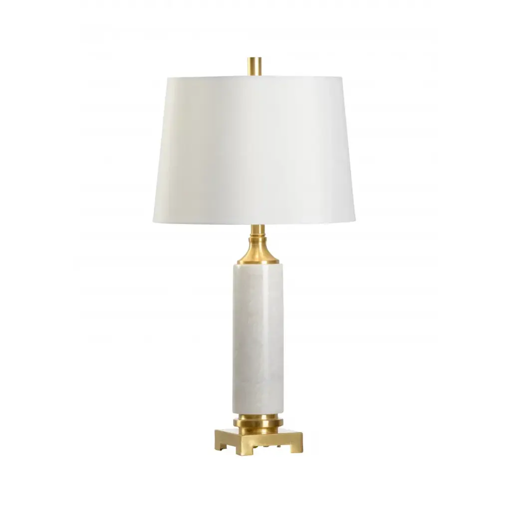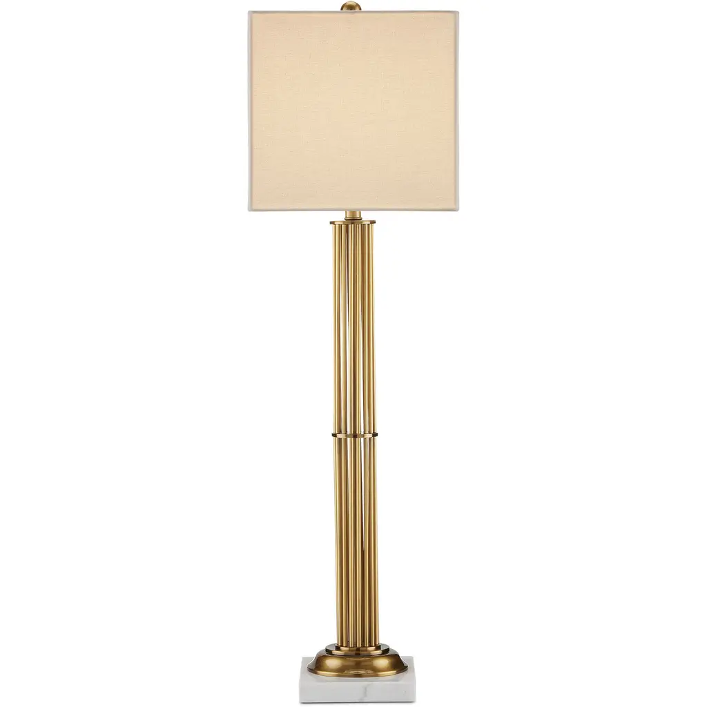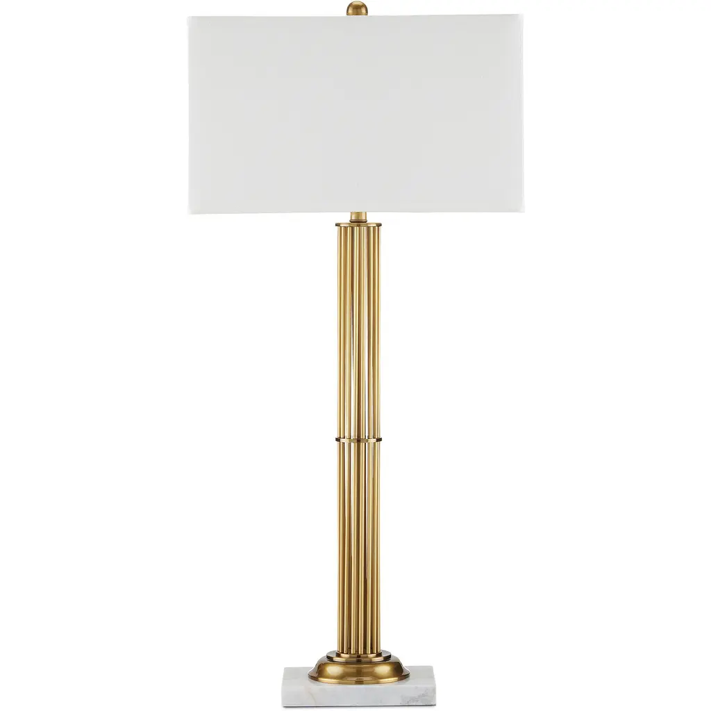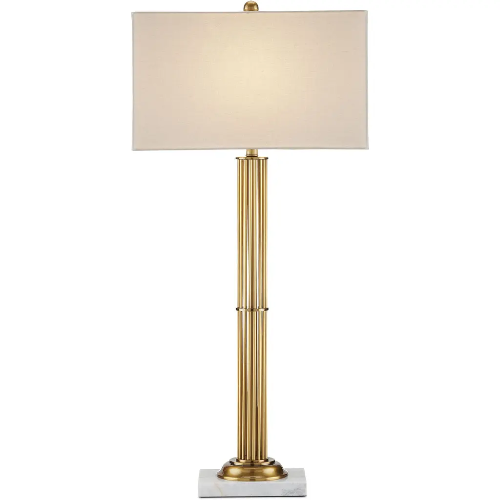 The design story the Allegory Table Lamp tells is a sleek and gleaming one. The extra tall and slender cylindrical body of the gold lamp is formed from rods made of metal in an antique brass finish that are cleverly clasped together by a thin central ring. The white marble base and rectangular shade are pale elements that contrast the warmth of the metal, including the matching antique brass finial.