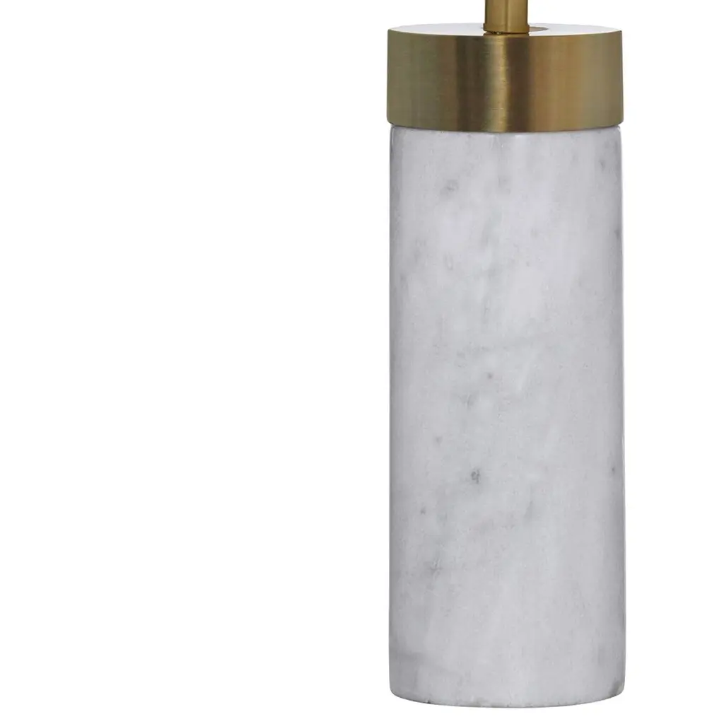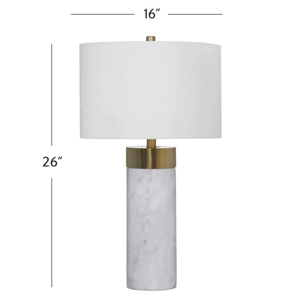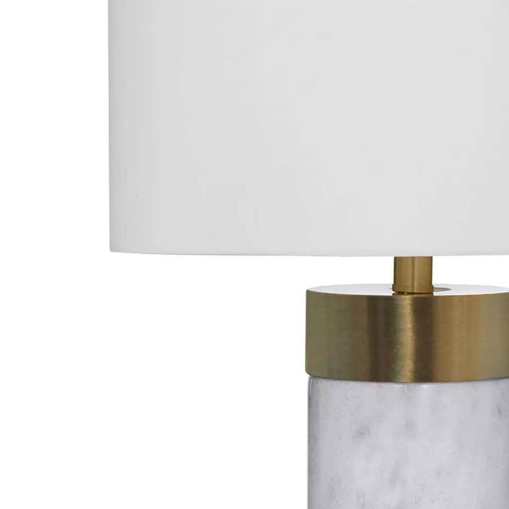 An antiqued brass cap adds warm contrast to the white marble body of this table lamp; a crisp white shade completes the design.