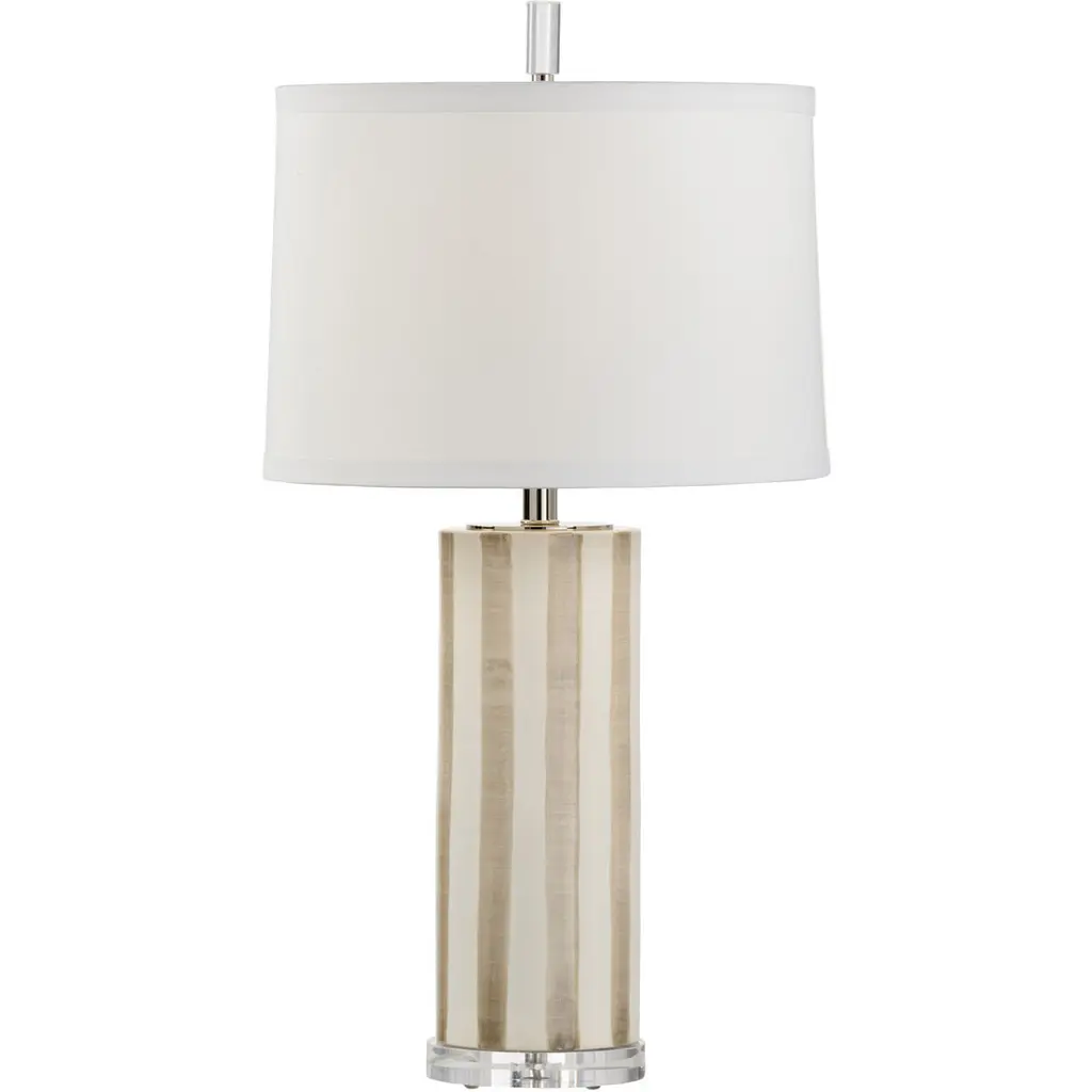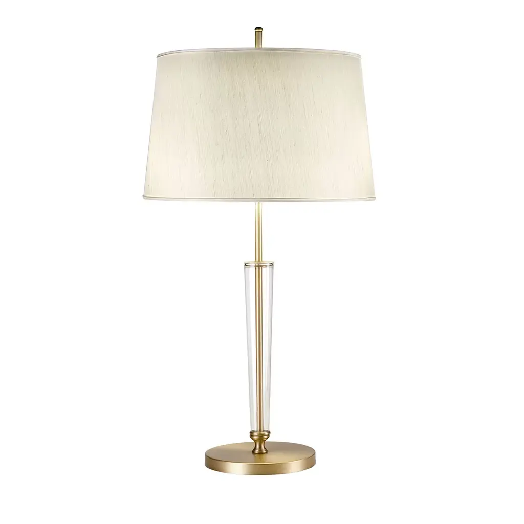 Recalling art deco charm with a modern twist, the Allen Table Lamp by Visual Comfort Signature, formerly known as Visual Comfort, is an elegant addition to the home. Standing atop a circular brass base, a series of glass rods stand side by side to create the lamp’s cylindrical body. An open-top paper shade tapers gently, surrounding the fixture’s lamping and adding a crisp contrast to the rigid body below. Its glass captures the light from its incandescent bulb beautifully, shimmering lightly while brightening the space.