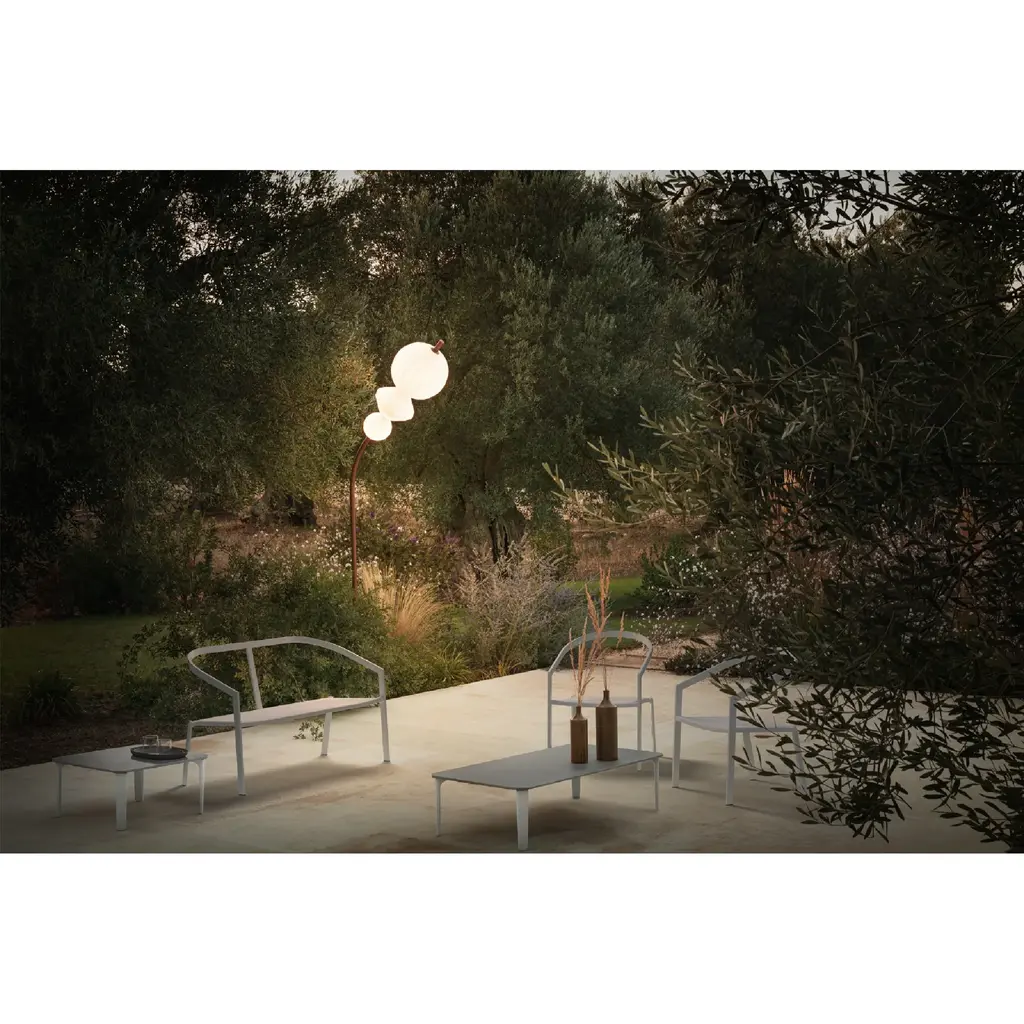 PATIO is a wireless lamp ideal for installations, designed to illuminate a table, either indoors or outdoors, without the need of a plug. Perfect for its use in hotels, restaurants, terraces...It uses a 3W LED light source with a maximum output of 420 lumens. Thanks to its polyethylene rotomolded shade, the light is dissipated evenly illuminating the space without shadows and the aluminium cover prevents the glare to the people sitting around the table. It houses a lithium battery that allows 8 hours of authonomy, that is charged with a USB charger (like the ones used for mobile phones) located at the base. Besides it has an on-off switch with three positions to adjust the light according to the needs of each moment.The base has silicone stoppers to prevent the luminaire to slide, in case the surface is not stable, as in boats or mobile homes.The finishes of the PATIO lamp, as well as its serene and smart design, give it great elegance apart from its functionality, as it can be placed anywhere regardless of having a plug nearby. The diffuser molded polyethylene in natural color and the body is made of sandblasted and anodized aluminium. With 1 Simple charger “1 USB/1 plug” 5V 1.5A + 1,5m cable to charge 1 lamp at a timeColor: SilverIP RATING: IP55 (suitable to outdoors)LED 5V 1.2A - 3W CITIZEN LED 3000K 60lm-140lm-260lm