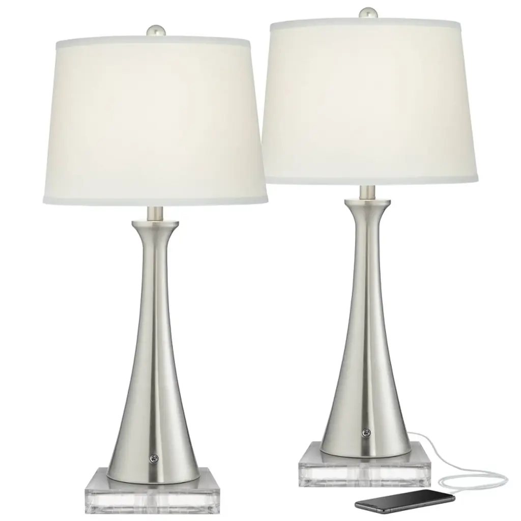 This ceramic reverse torch style table lamp is a great additon to any beside area, coffee table or home office. It features a clear glass body set on a circular metal brushed steel base. This table lamp is sold as a pair and ships complete with matching s