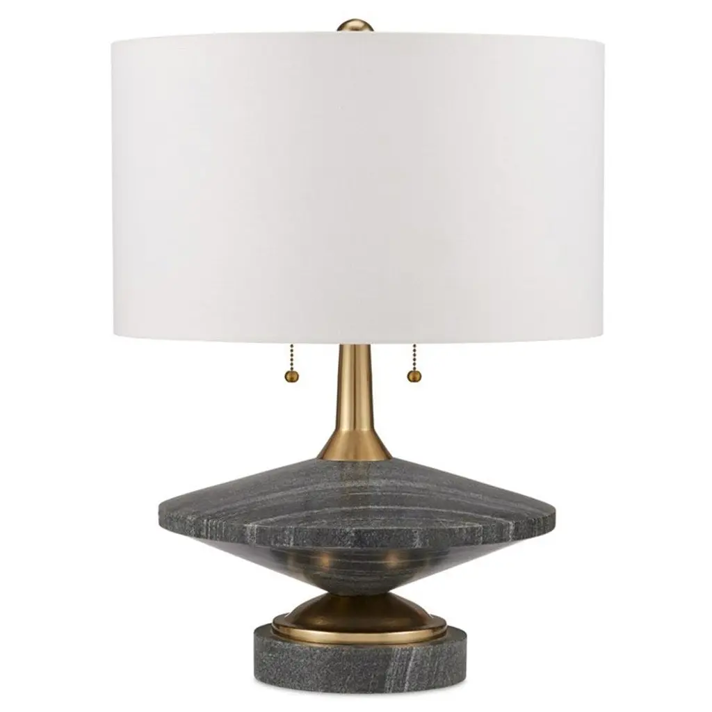 Alsace Table Lamp uses a unique combination of mixed materials to create a striking feature lamp. The antique brass parts are a stunning transition between the chunky, natural brown marble base and slender cork column. Under an off-white, silk shade, two lights with pull chains provide ample lighting throughout any space.
