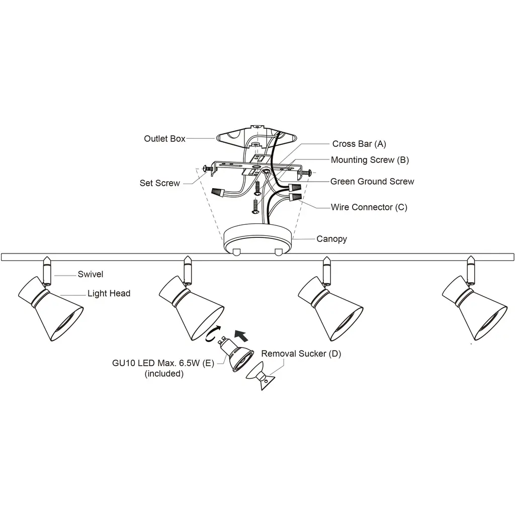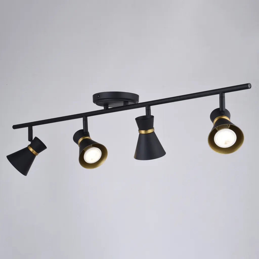 The Alto directional spot light collection shines bright in a 4-light linear flush mount. Four adjustable lamps offer the option of precise lighting for any large interior space. The matte black and gold satin brass finish combination sleekly adds an element of modernism to the tapered shades making the Alto the perfect solution for any living or working space. Included LED bulbs provide energy savings, low maintenance and long lasting performance.