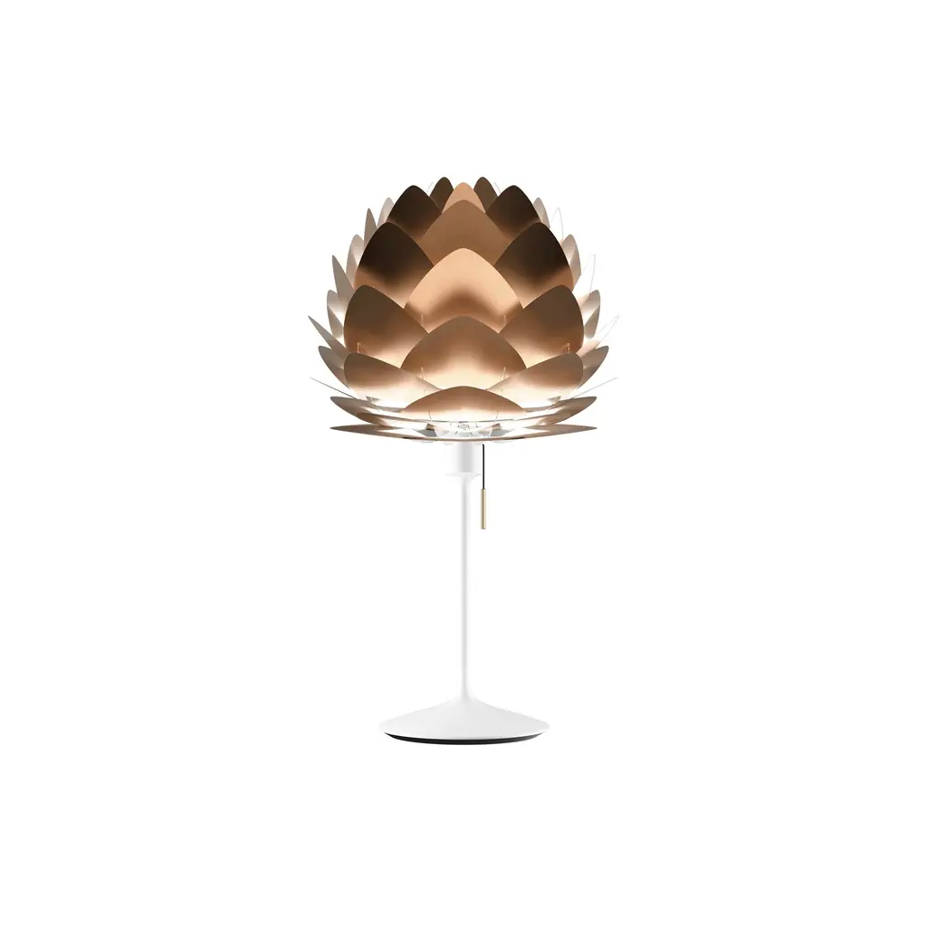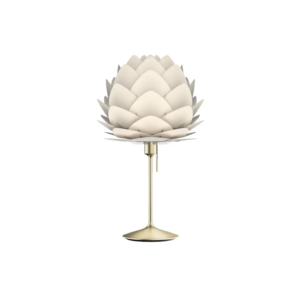 Aluvia's flower-like LED light from Umage cofounder and designer Sřren Ravn Christensen gets a kick from its curvy Champagne table base. The sprouting metal shade is fashioned in lightweight but sturdy aluminum in bronze or brass brushed finishes or an appealing range of accent hues. The glamor quotient continues with the elegant stand in a choice of brushed steel or brass as well as black and white, to go with the shade in mini or medium sizes.