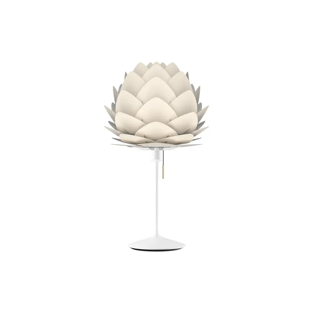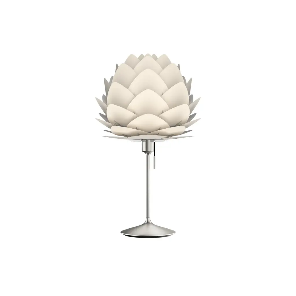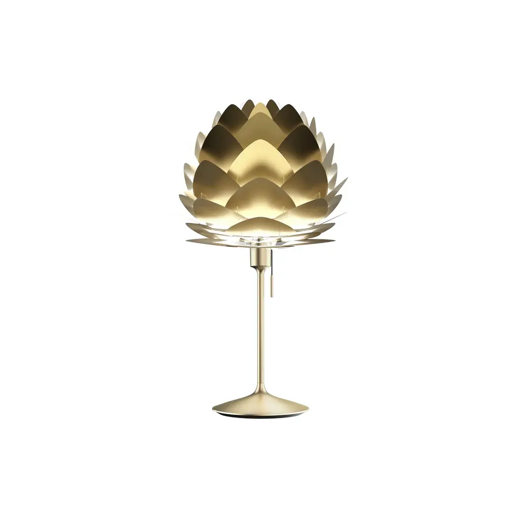 Aluvia's flower-like LED light from Umage cofounder and designer Sřren Ravn Christensen gets a kick from its curvy Champagne table base. The sprouting metal shade is fashioned in lightweight but sturdy aluminum in bronze or brass brushed finishes or an appealing range of accent hues. The glamor quotient continues with the elegant stand in a choice of brushed steel or brass as well as black and white, to go with the shade in mini or medium sizes.