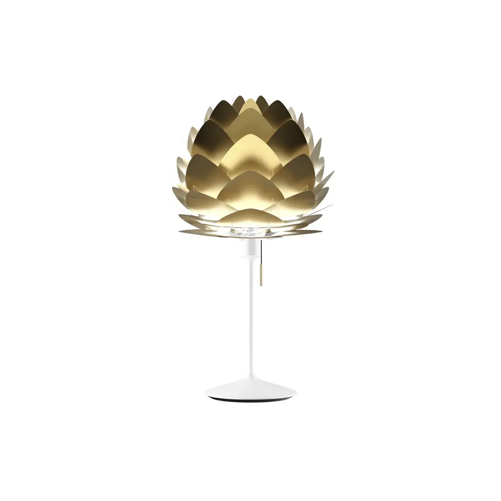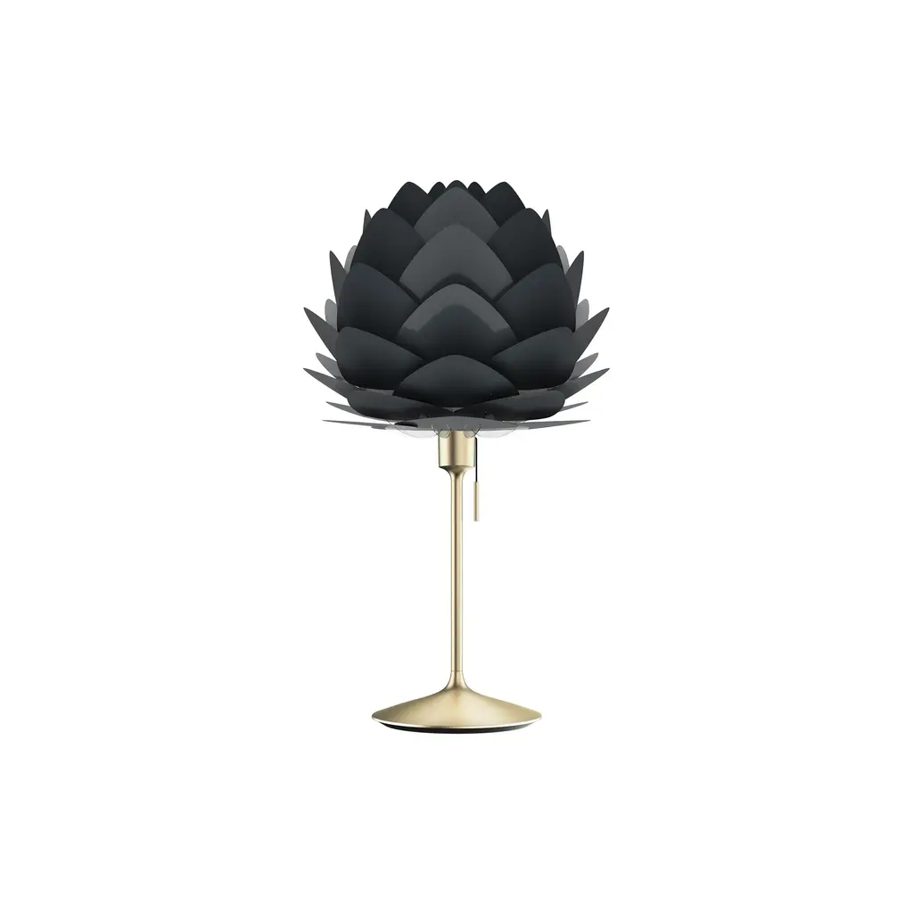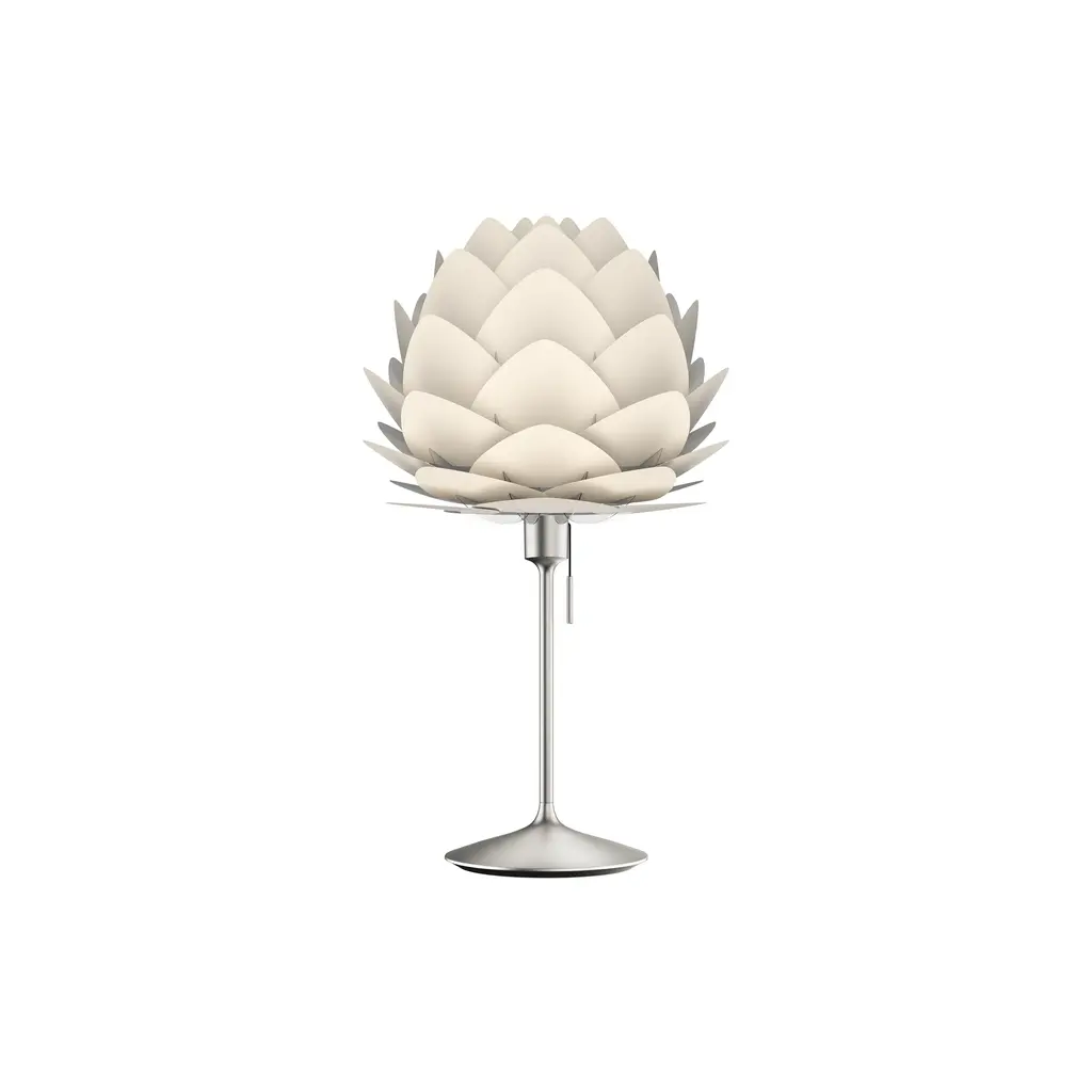 Aluvia's flower-like LED light from Umage cofounder and designer Sřren Ravn Christensen gets a kick from its curvy Champagne table base. The sprouting metal shade is fashioned in lightweight but sturdy aluminum in bronze or brass brushed finishes or an appealing range of accent hues. The glamor quotient continues with the elegant stand in a choice of brushed steel or brass as well as black and white, to go with the shade in mini or medium sizes.
