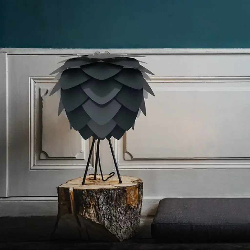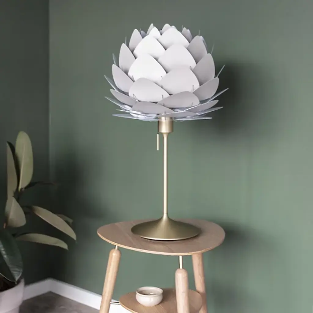 Creates a visually captivating accent piece. The Aluvia Table Lamp by UMAGE instantly becomes a conversation starter in any room. It features a simple white tripod base, but the shade is what draws the eye. It's made from 60 individual petals, all cut from real aluminum and painted to reflect the light from an internal source. It's ideally suited as a standout piece among your other décor but also paired with coordinating fixtures.