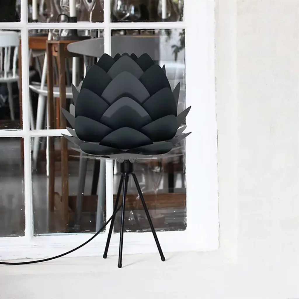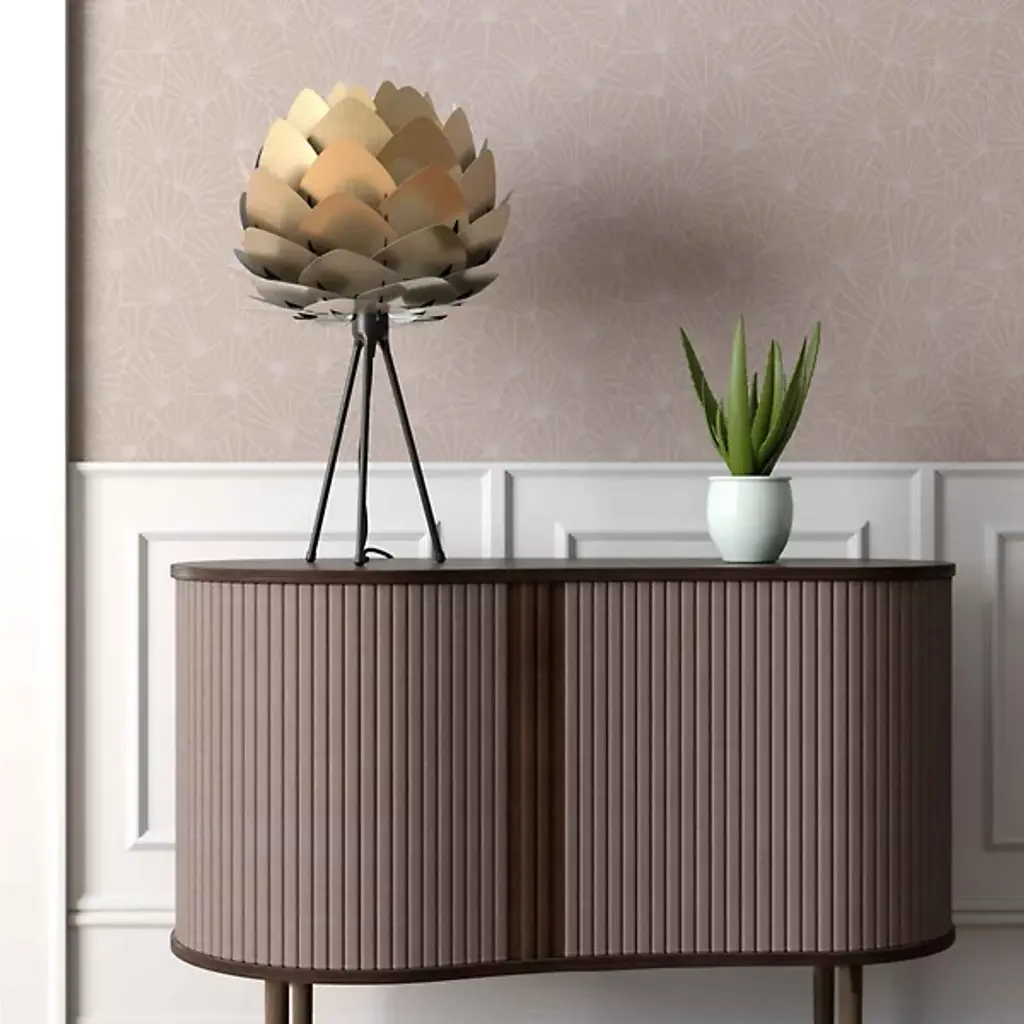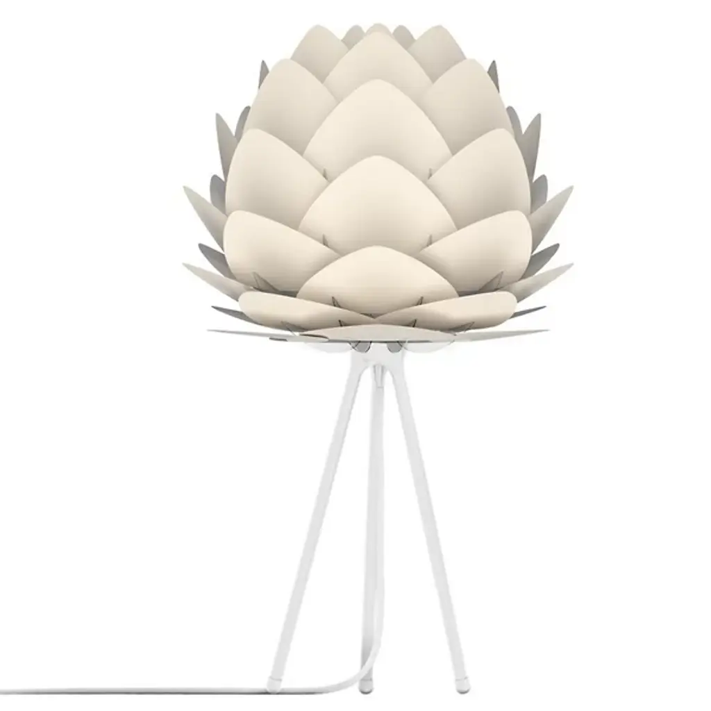 Creates a visually captivating accent piece. The Aluvia Table Lamp by UMAGE instantly becomes a conversation starter in any room. It features a simple white tripod base, but the shade is what draws the eye. It's made from 60 individual petals, all cut from real aluminum and painted to reflect the light from an internal source. It's ideally suited as a standout piece among your other décor but also paired with coordinating fixtures.