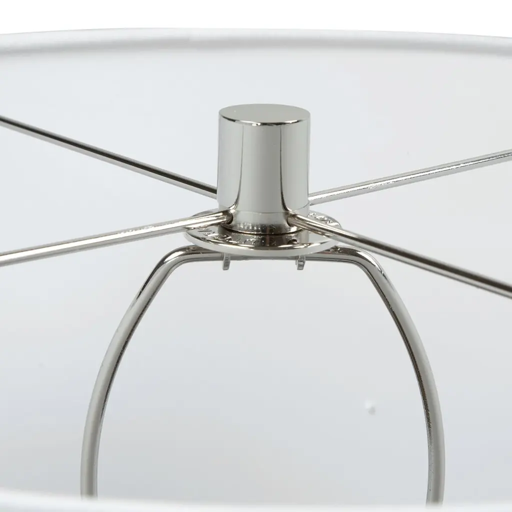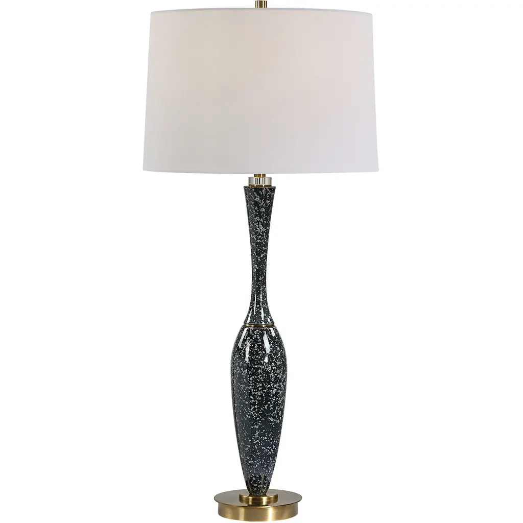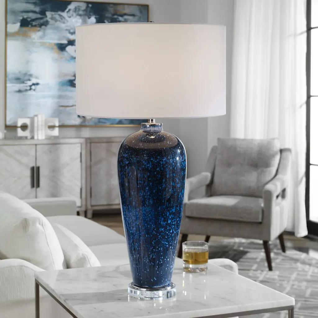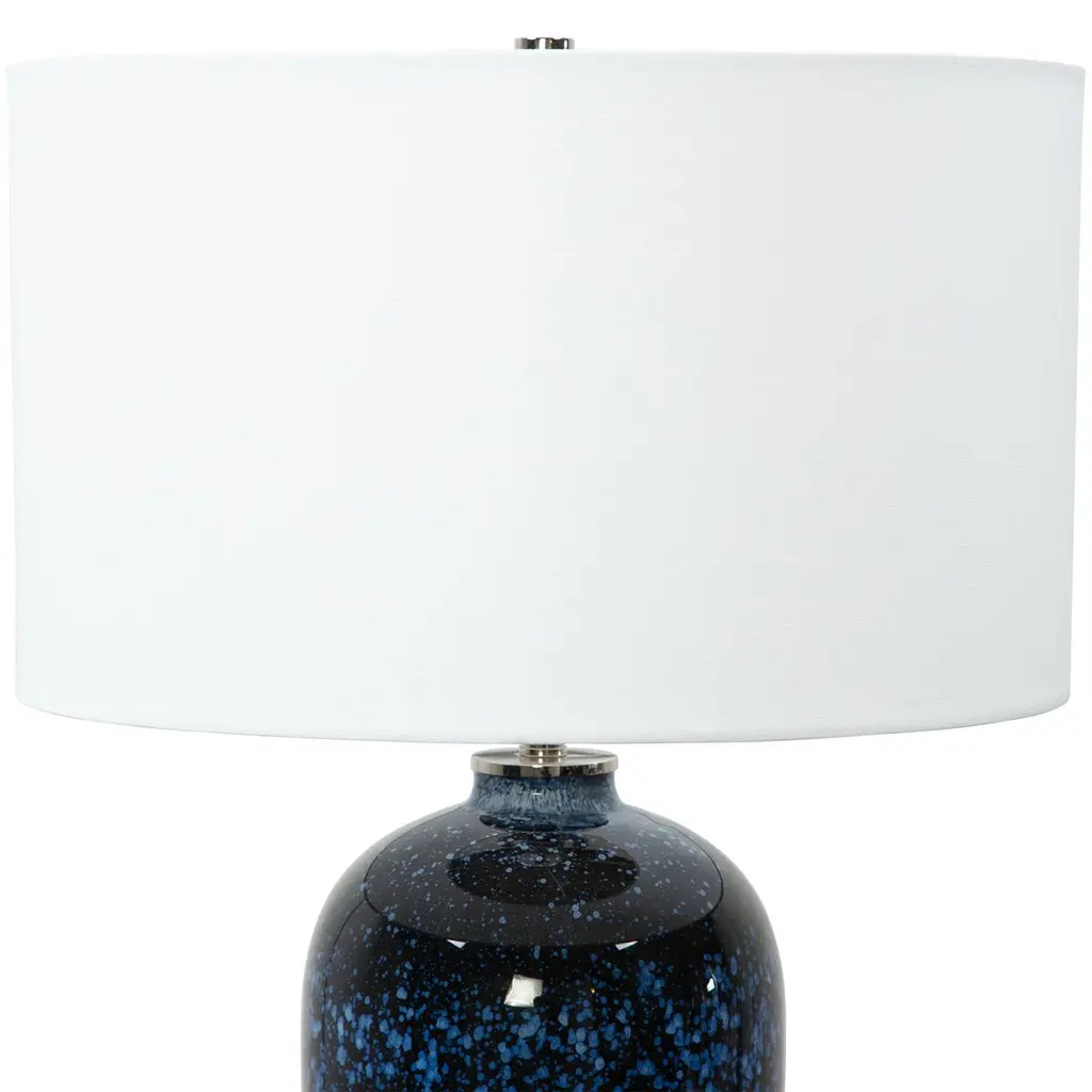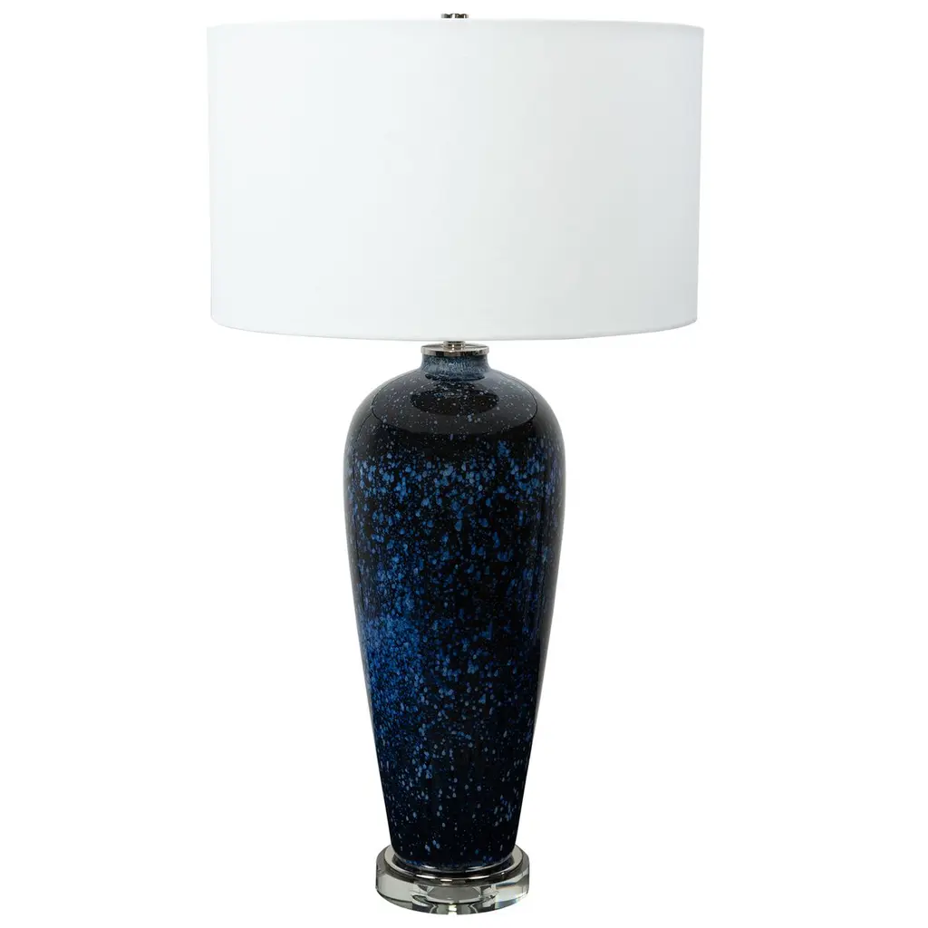 The Alvaro Table Lamp captures the enchanting allure of the evening sky with its exquisite art glass base, showcasing a harmonious blend of deep hues. The elegant crystal foot and polished nickel plated accents add a touch of sophistication, while the crisp white hardback drum shade provides a perfect finishing touch. This lamp is a stunning addition to any space, offering both beauty and functionality.