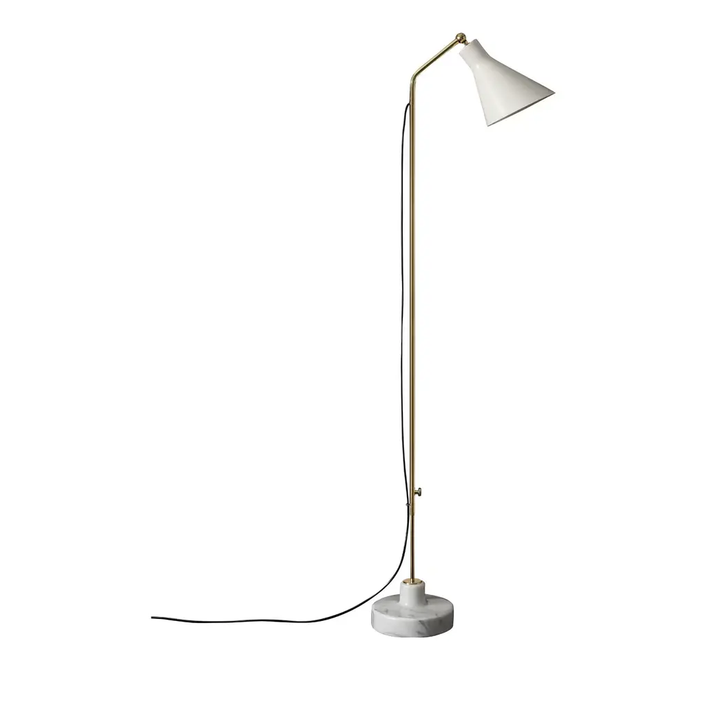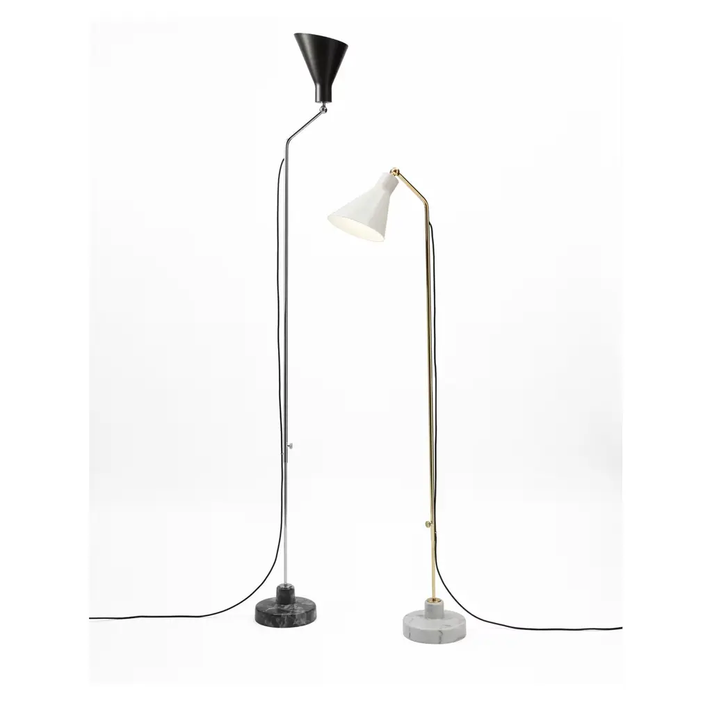 This lamp is a true product of exceptional craftsmanship. It is the new edition of an original design by Ignazio Gardella from 1948 in which the adjustable light can go from a table lamp into a tall floor lamp in the blink of an eye. Its solid base is a round cut piece of Carrara marble and its structure is in lustrous brass and aluminum. It is also available in Marquina marble with a nickel and chrome structure or in grey Manganese.